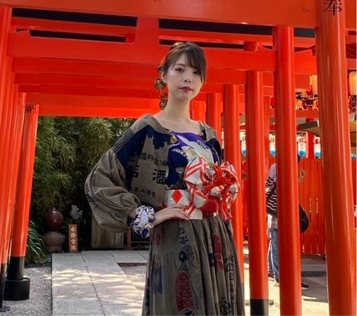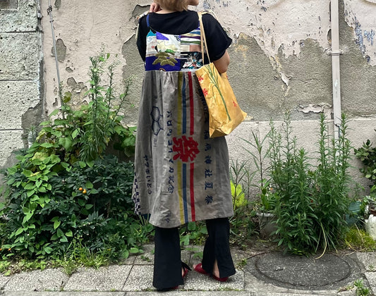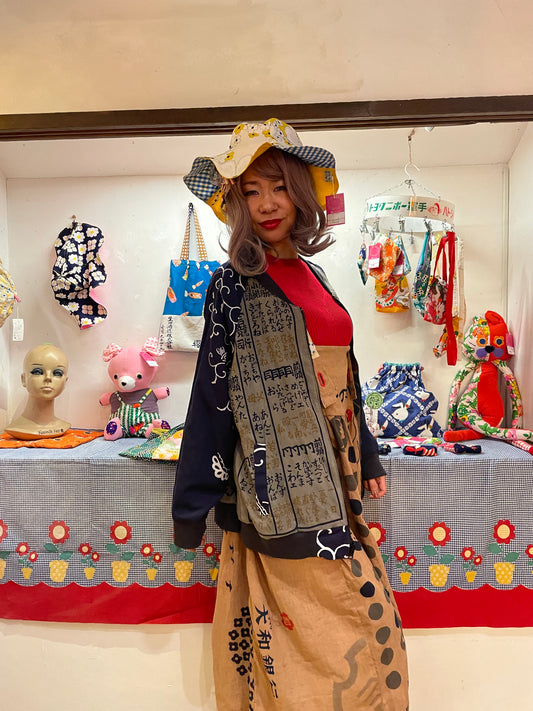 meihana makes clothes by remaking old Japanese fabrics such as tenugui hand towels, kimonos, flags, and furoshiki wrapping cloths.
