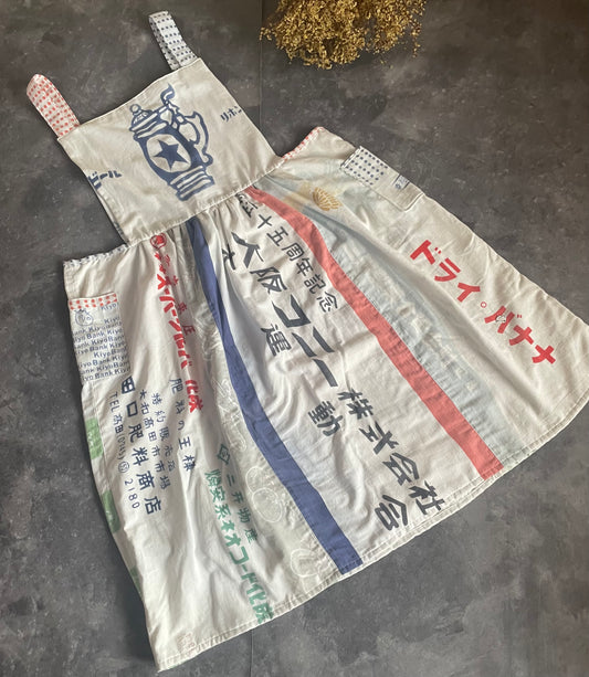 Cotton apron dress remade from Japanese hand towel 白い手ぬぐいをリメイクしたエプロンワンピース