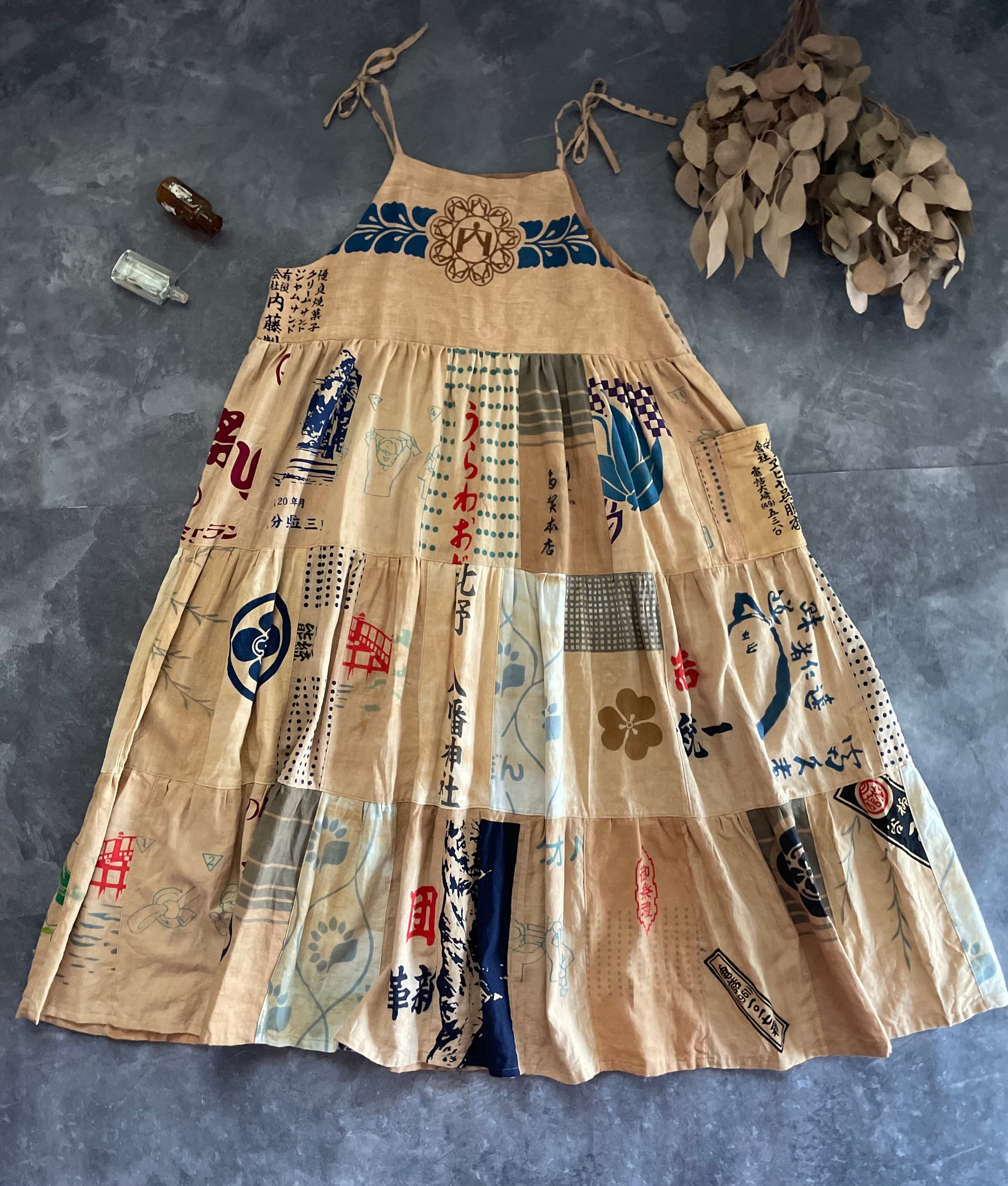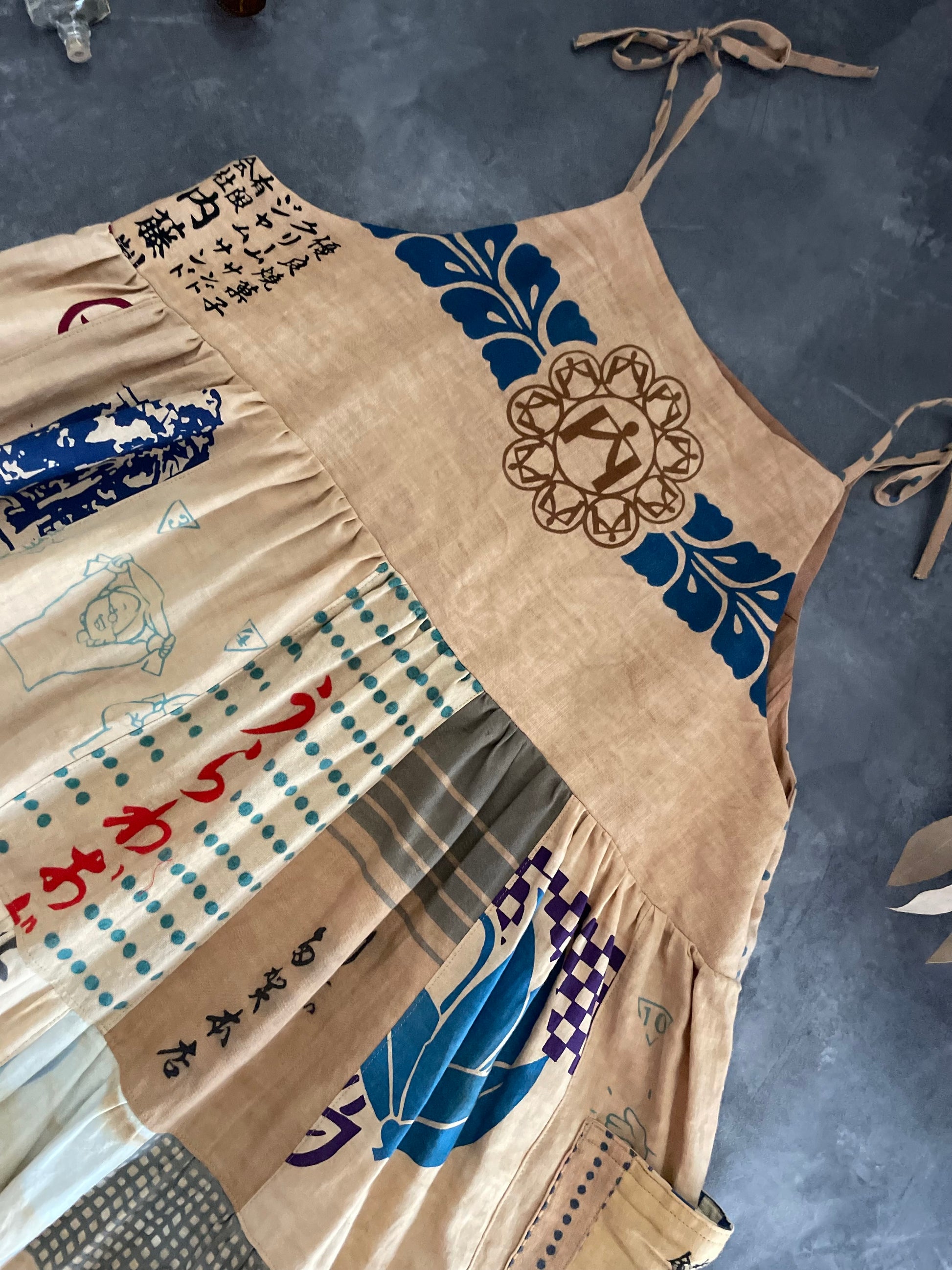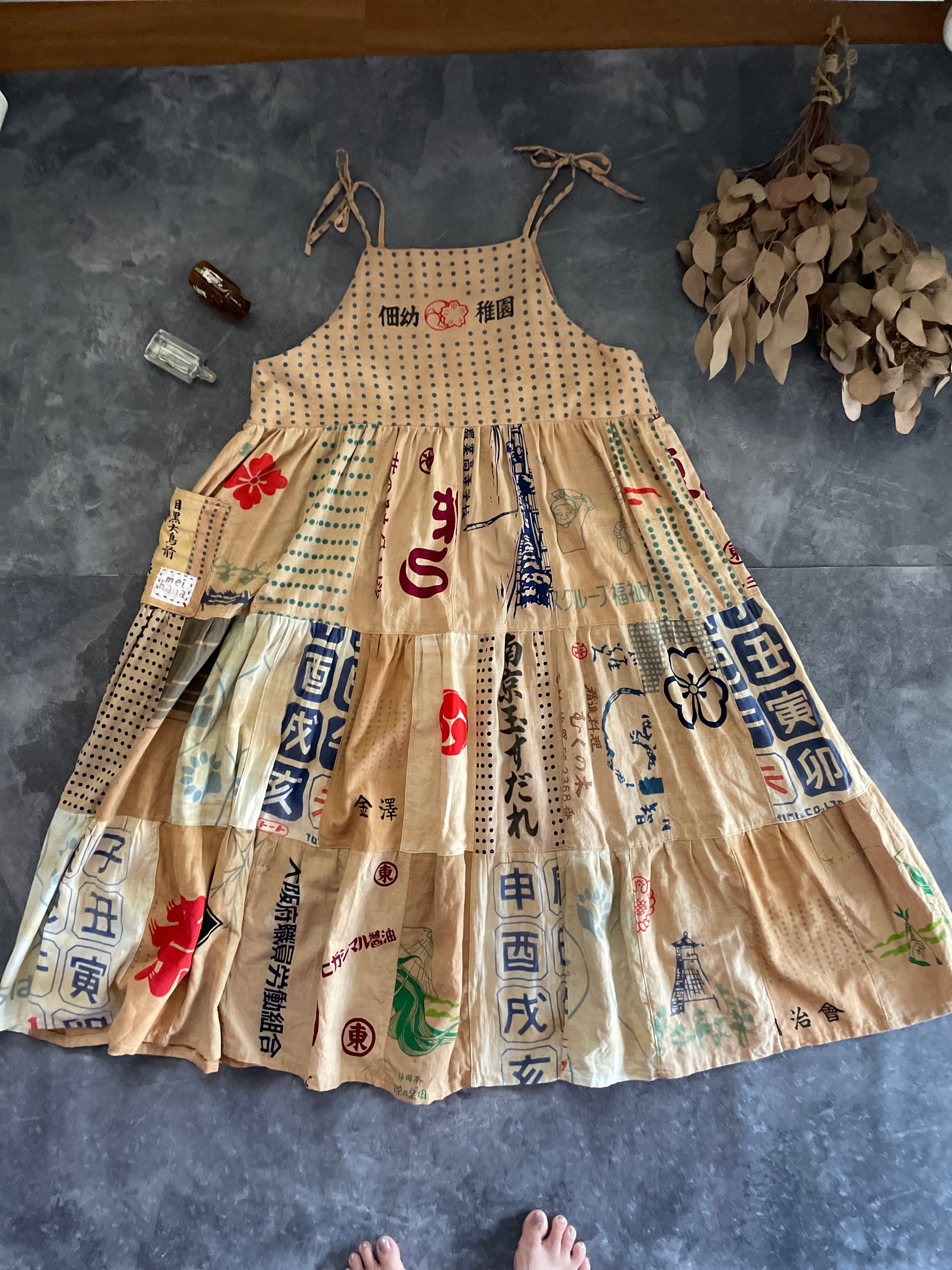 たくさんの柿渋染め手ぬぐいを細くカットして繋いだティアードワンピース。