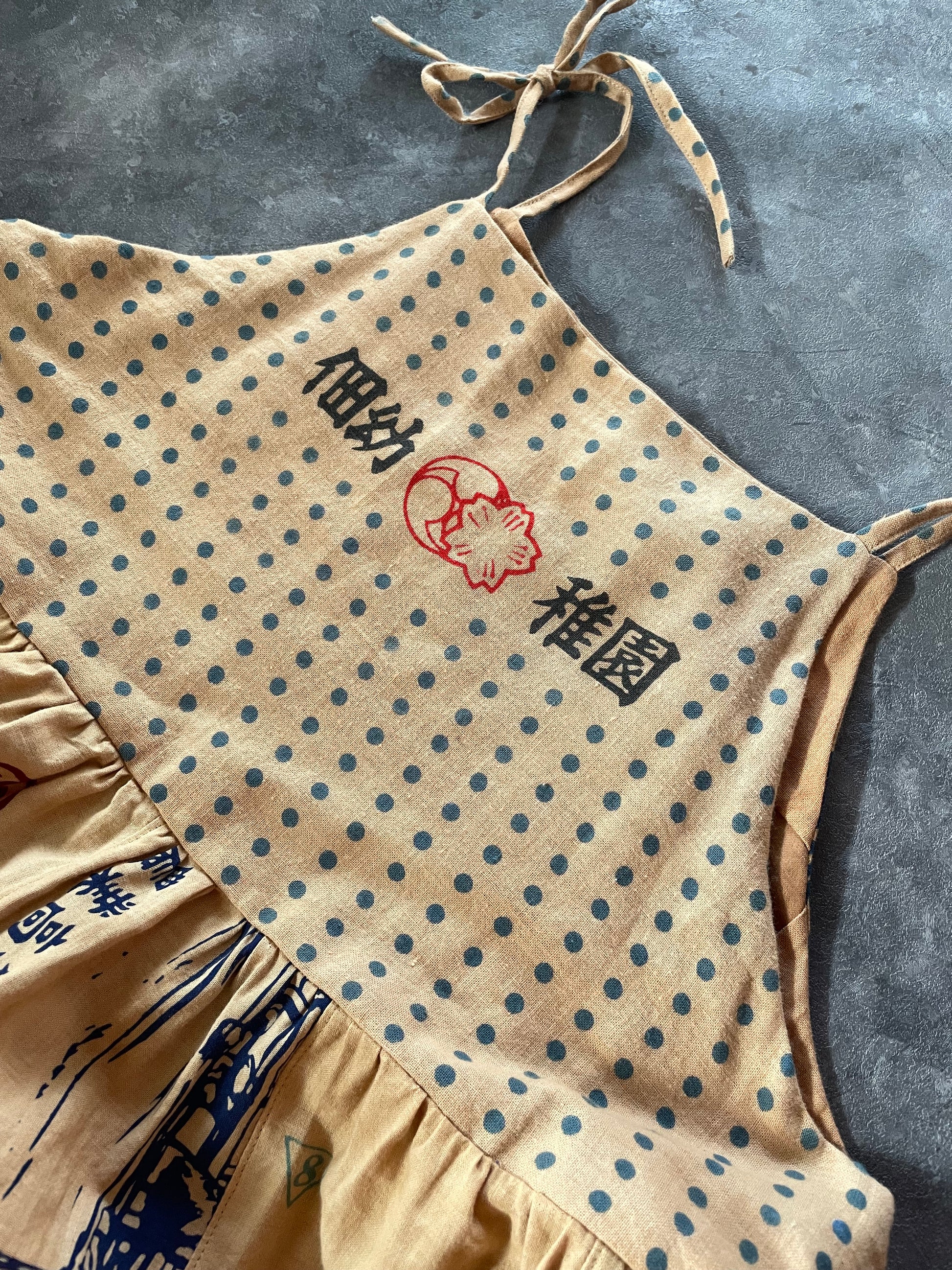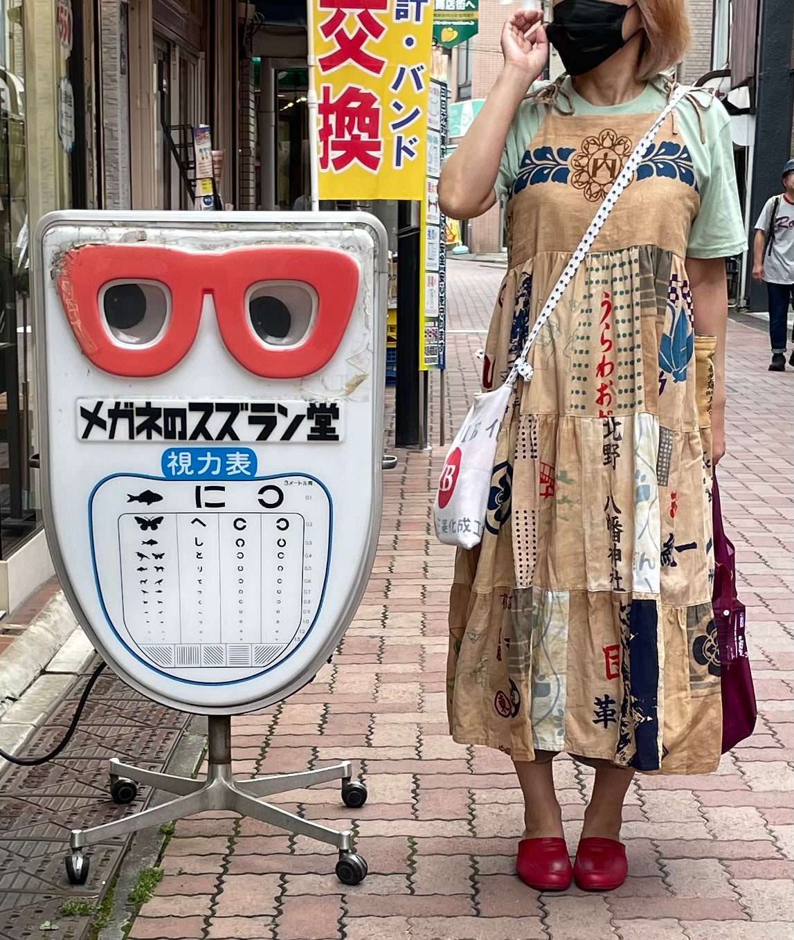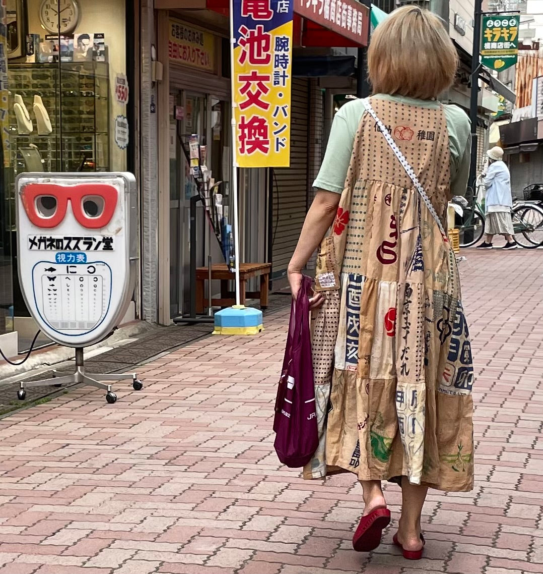 たくさんの柿渋染め手ぬぐいを細くカットして繋いだティアードワンピース。