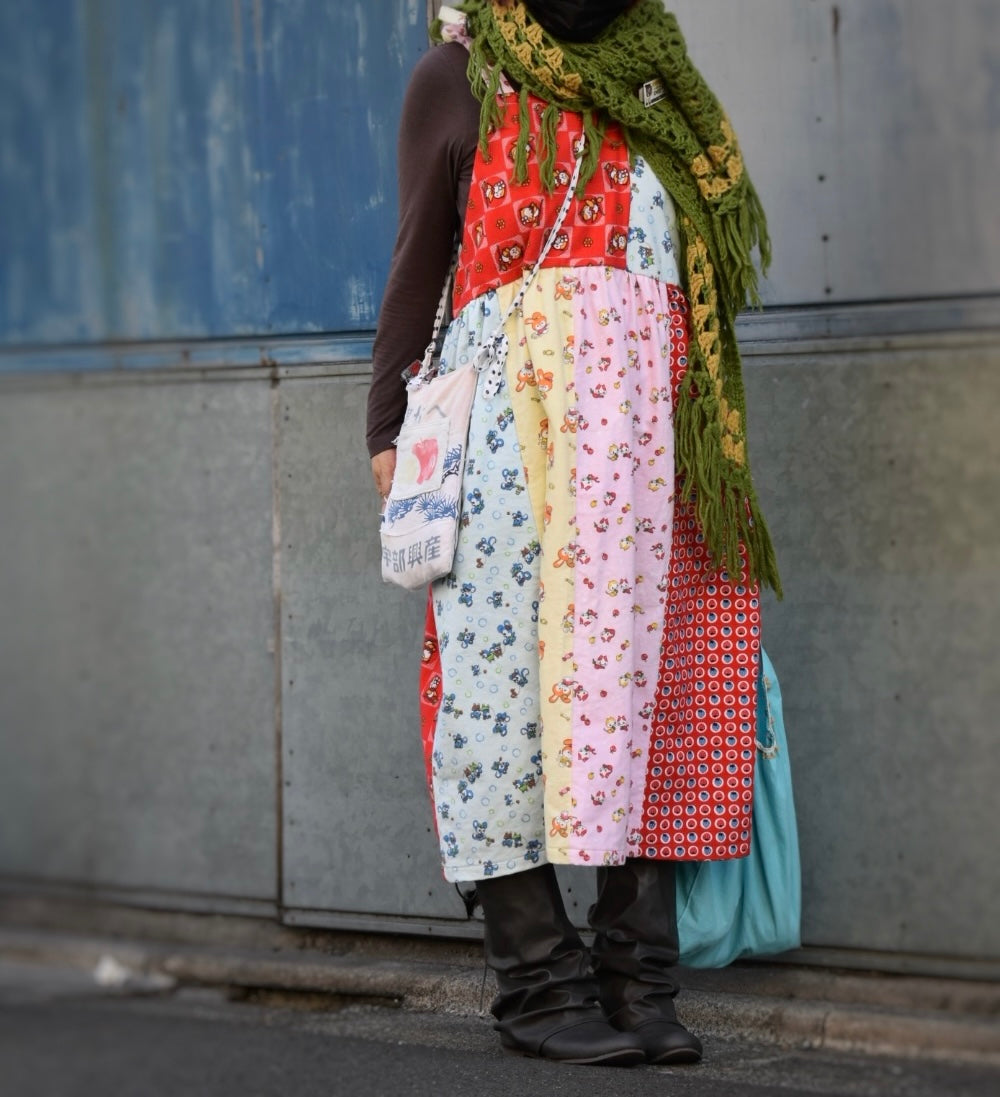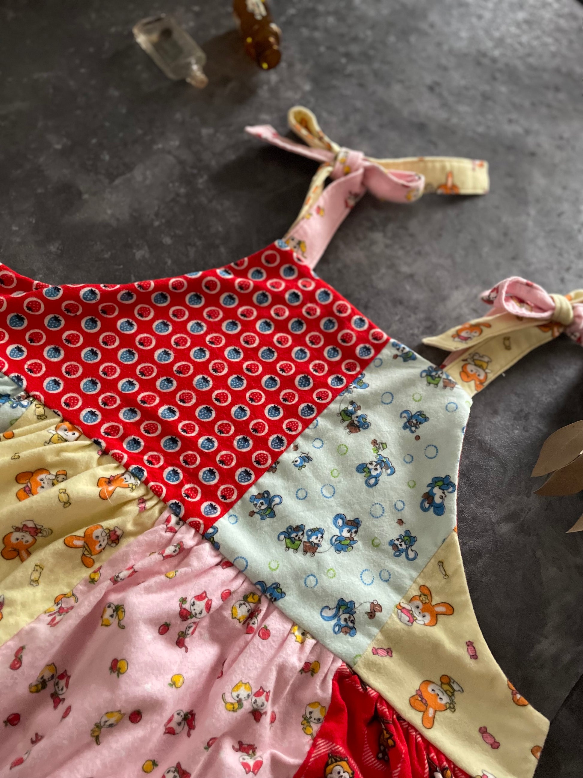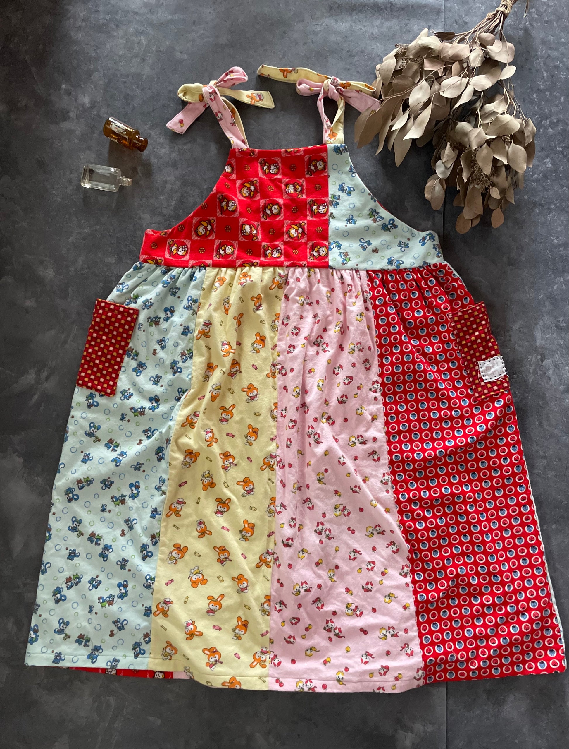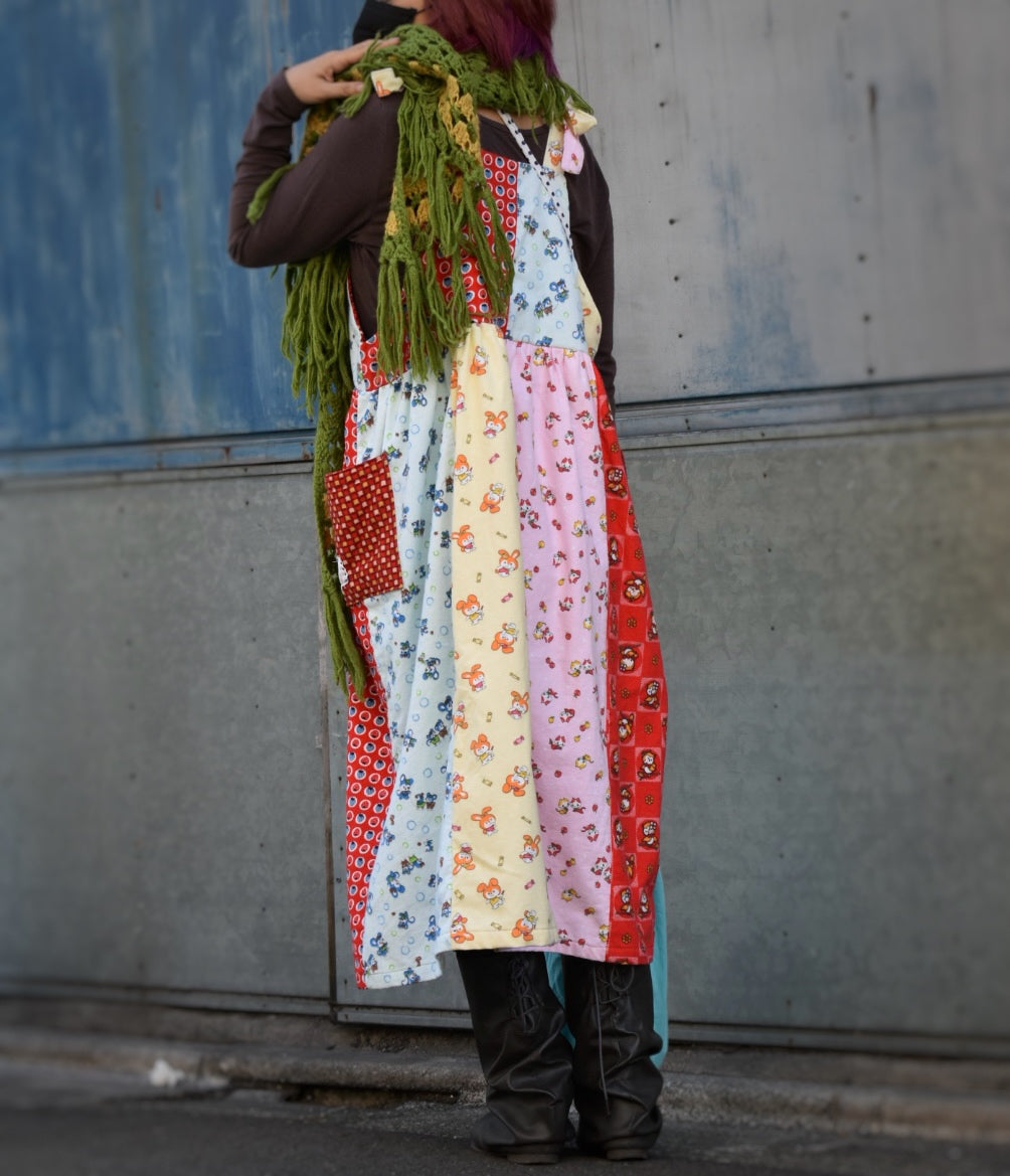 レトロなアニマル柄の子供用のネル素材の着物をパッチワークしてかわいいサロペットワンピースを作りました。