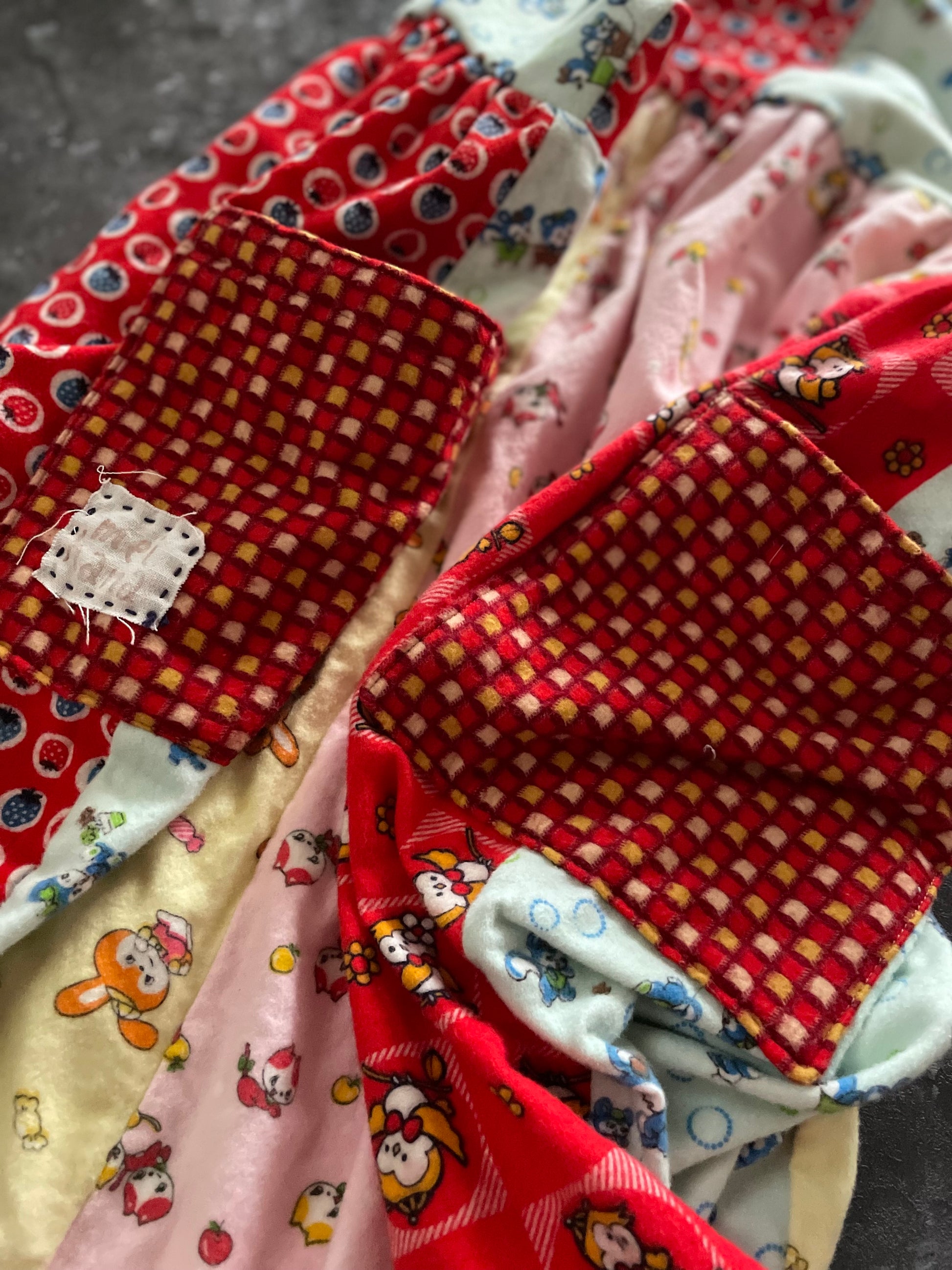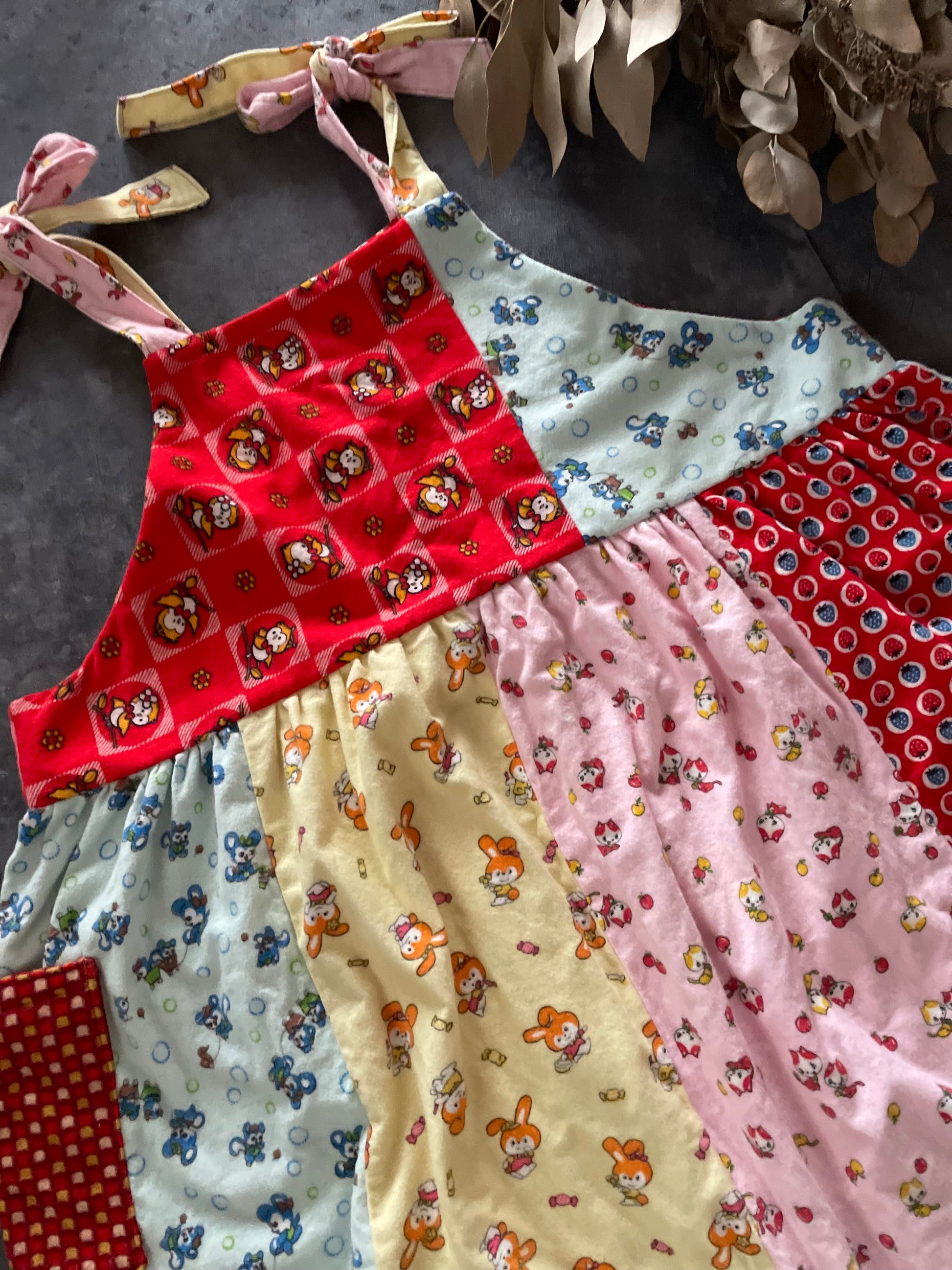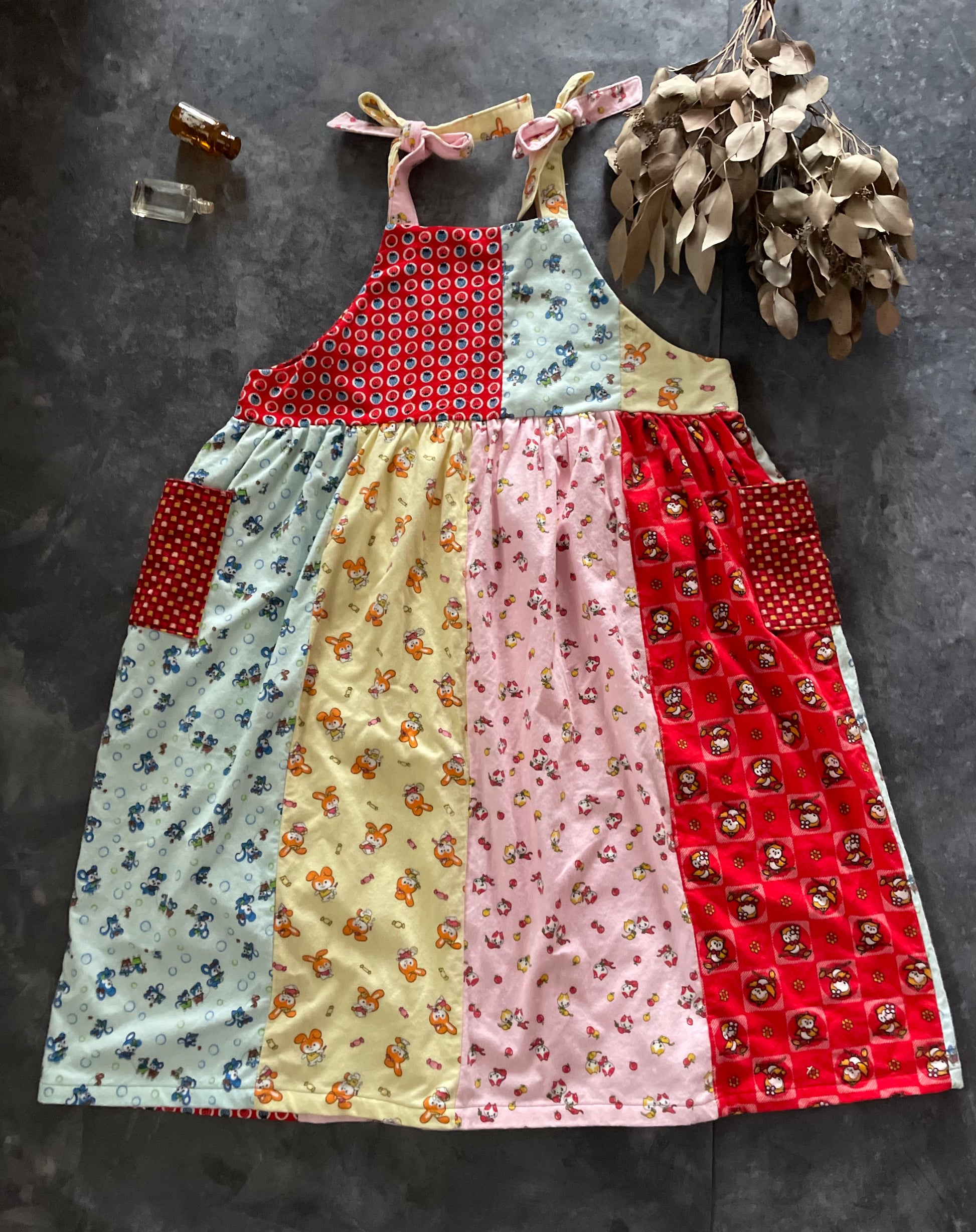 レトロなアニマル柄の子供用のネル素材の着物をパッチワークしてかわいいサロペットワンピースを作りました。