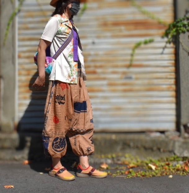 柿渋で繰り返し染めたてぬぐいをたくさんパッチワークしたサルエルパンツです。