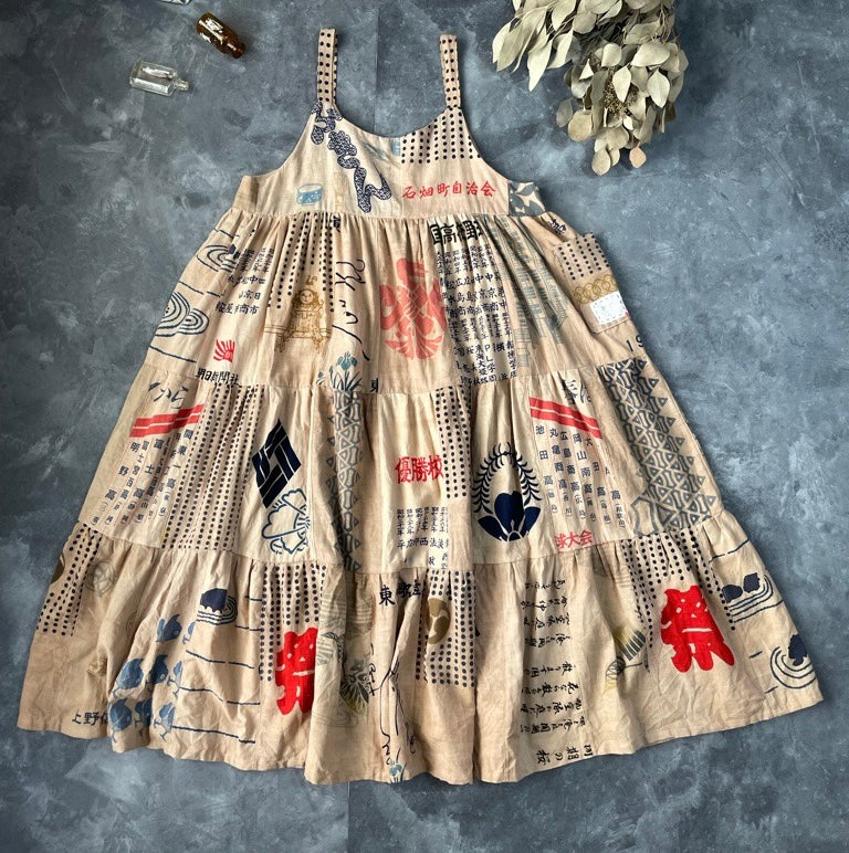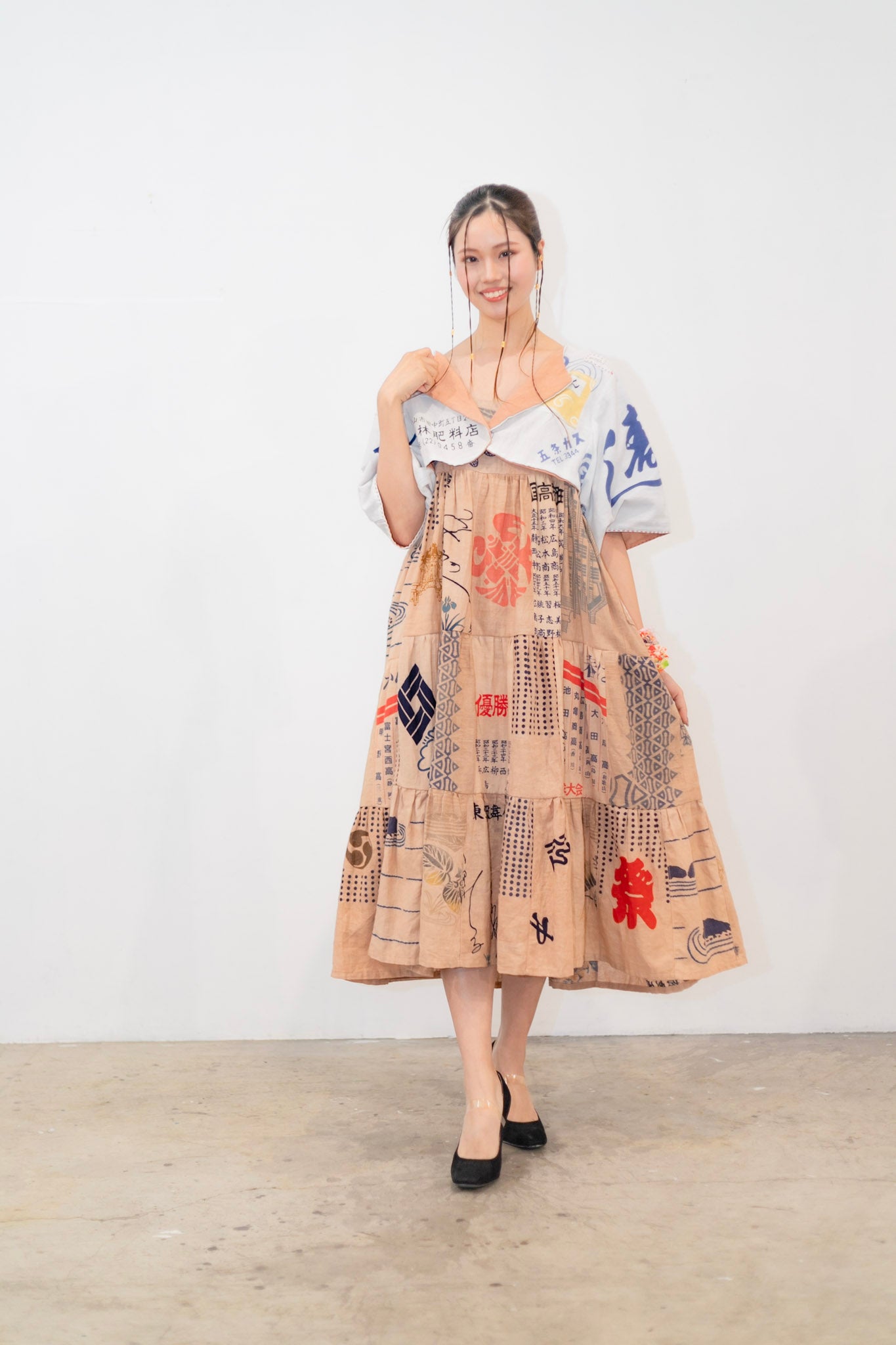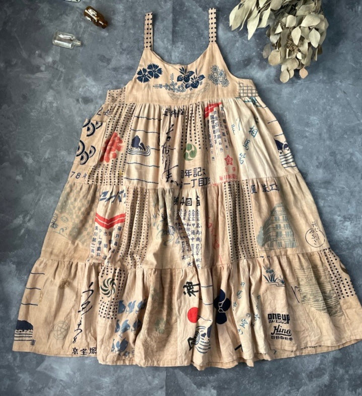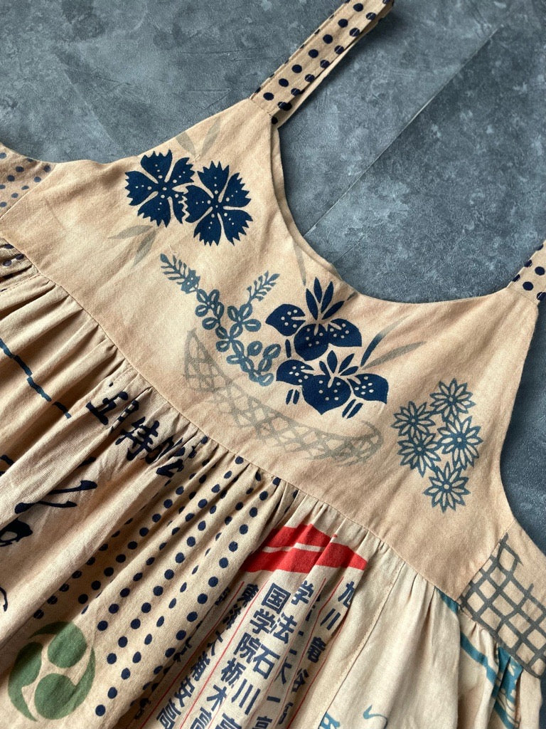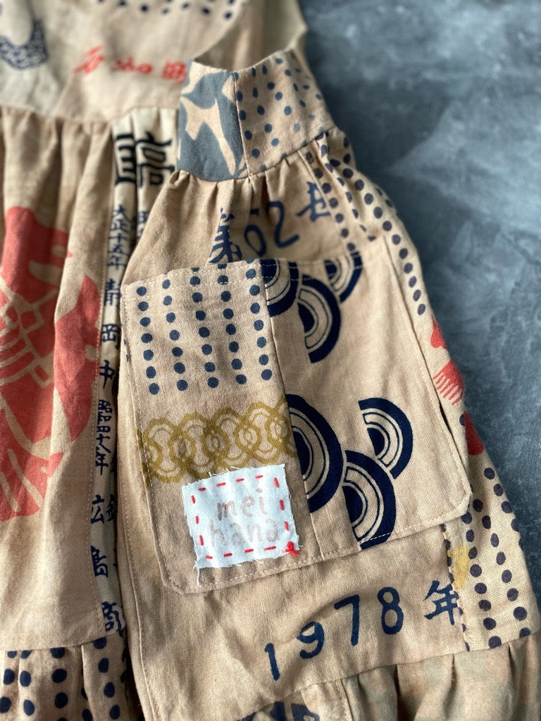 たくさんのレトロな手ぬぐいをピンクに染め、小さくカットして、3段のティアードワンピースを作りました。