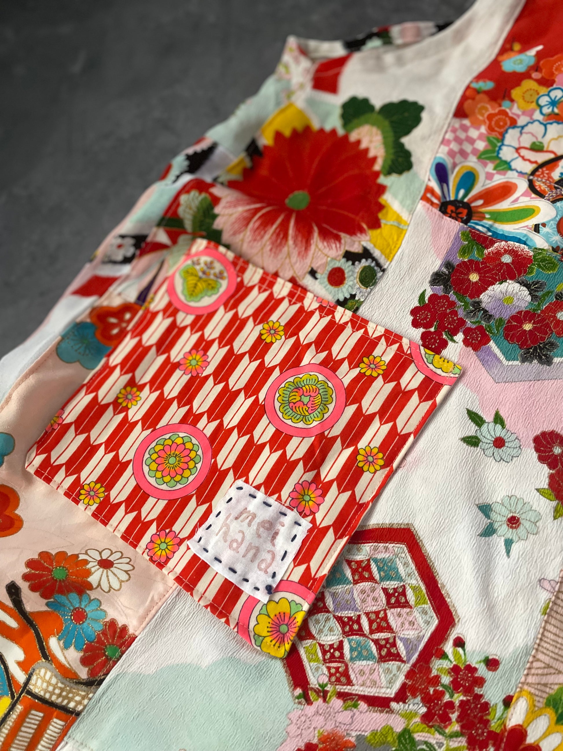 たくさんのかわいい柄の女の子用の着物をほどいて組み合わせ、サロペットパンツを作りました。