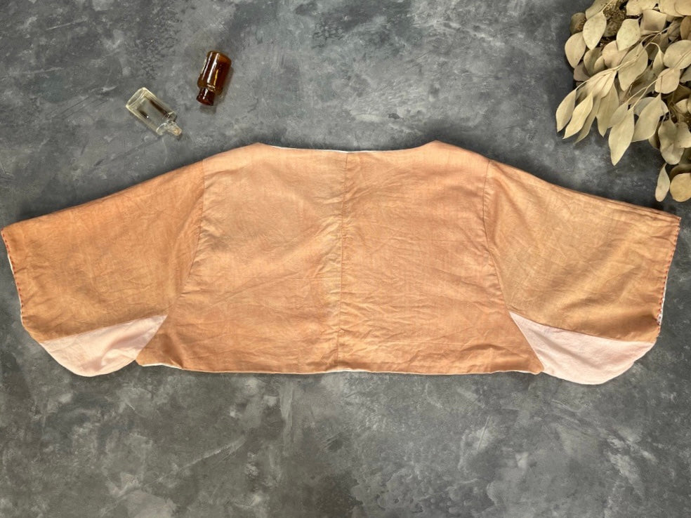 たくさんのレトロな手ぬぐいをパッチワークした面と、ピンクに染めたコットン素材の面のリバーシブルのボレロです。