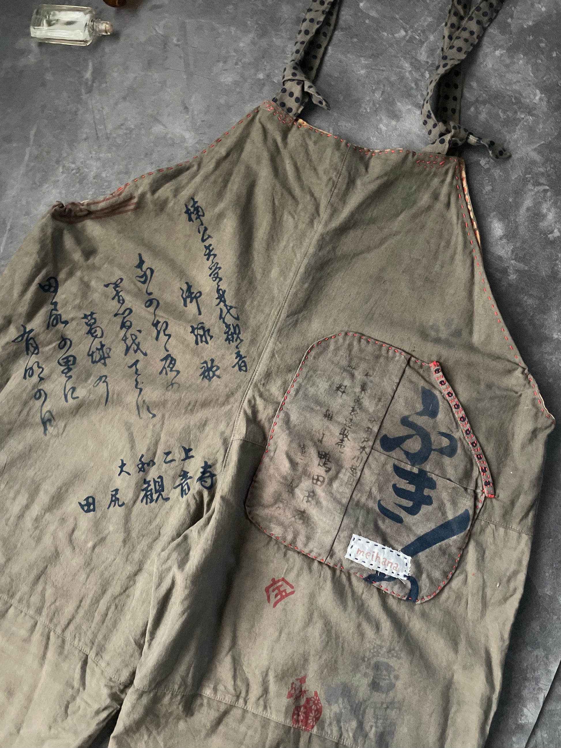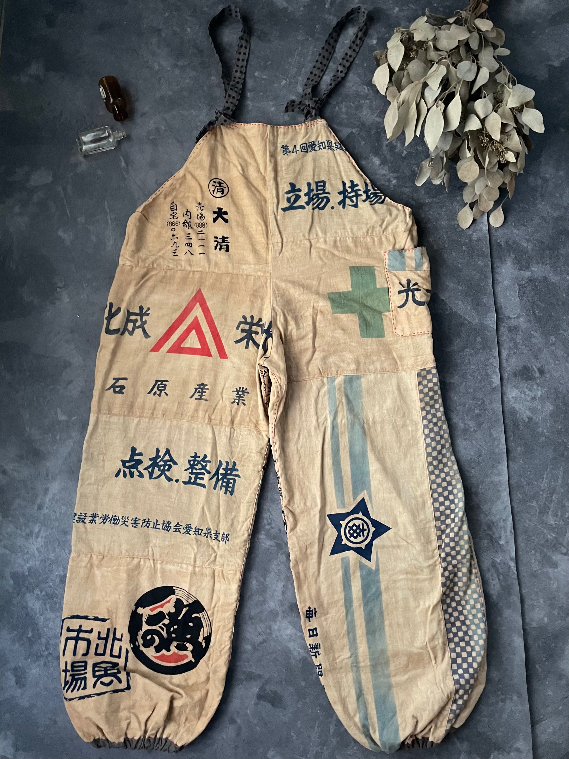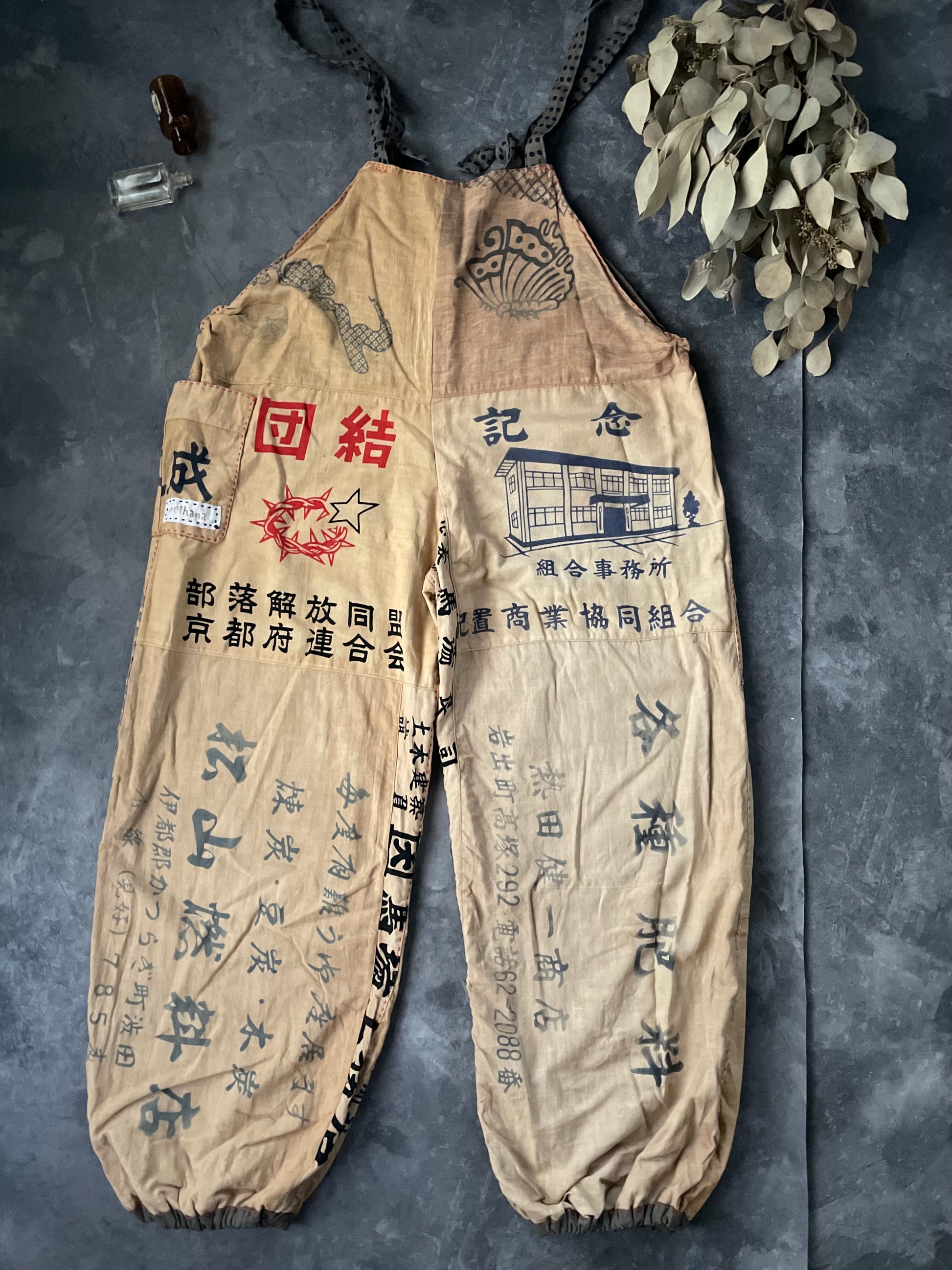 柿渋染めと、柿渋染め鉄媒染の手ぬぐいをパッチワークしてリバーシブルのサロペットパンツを作りました。