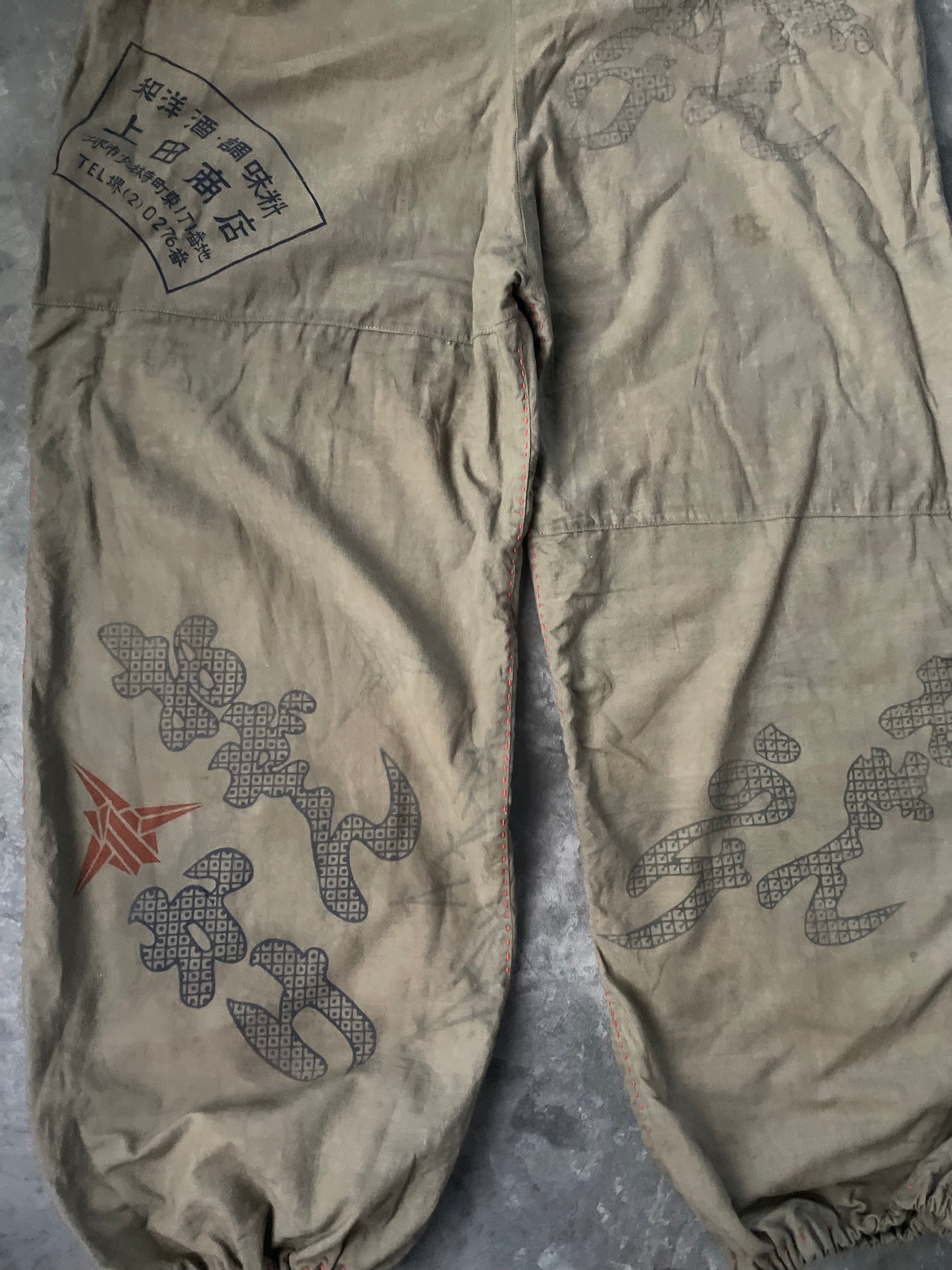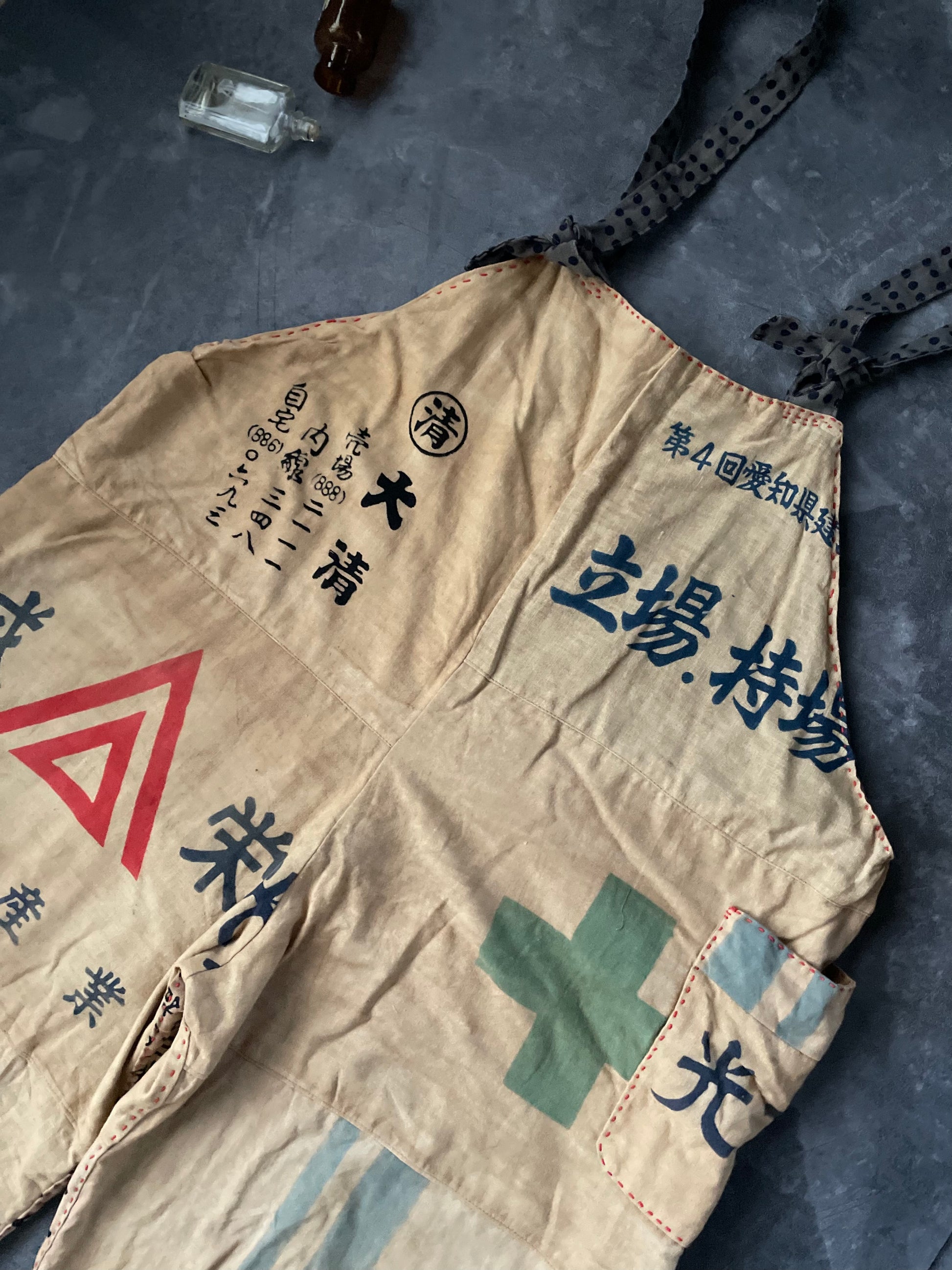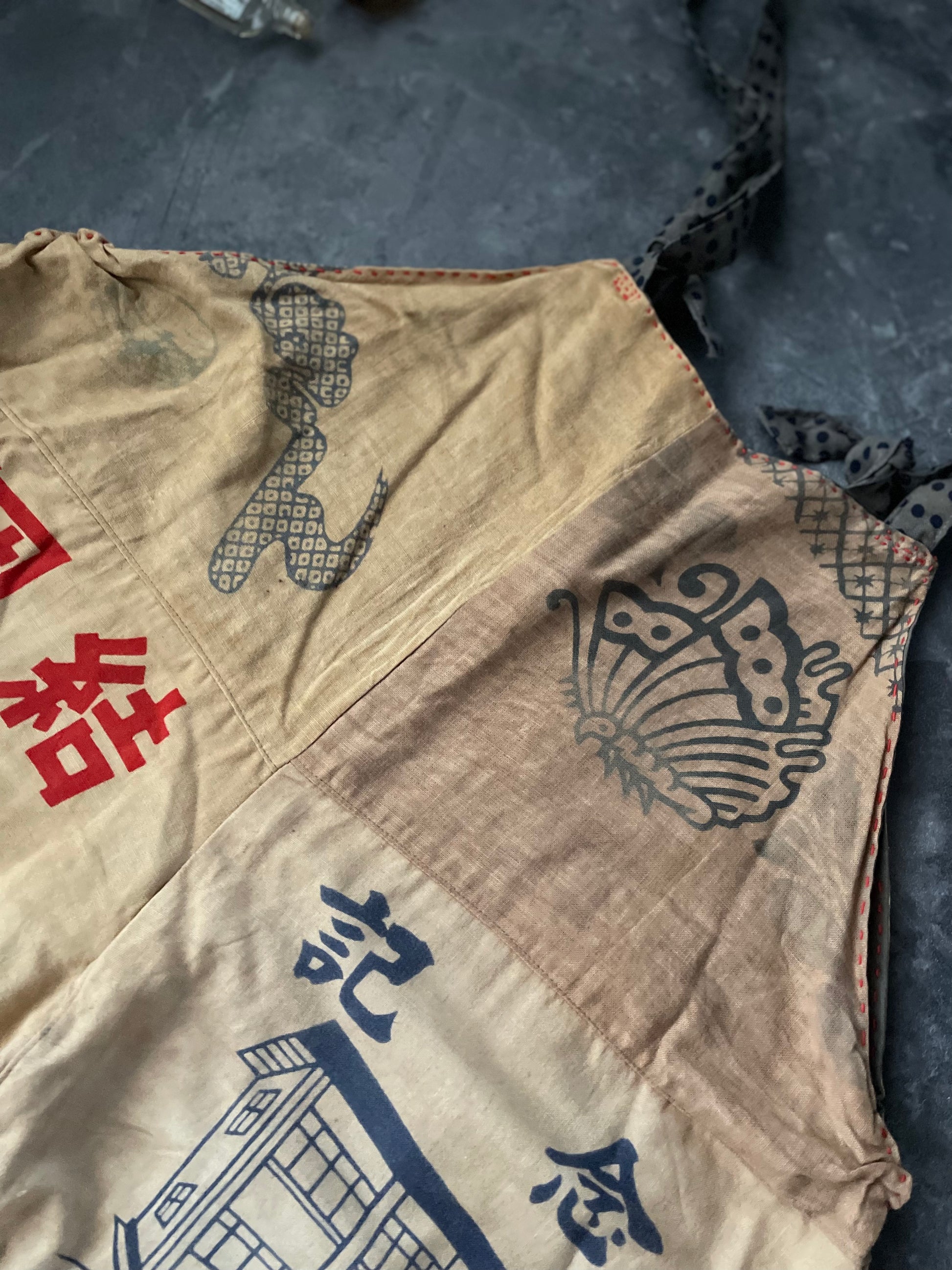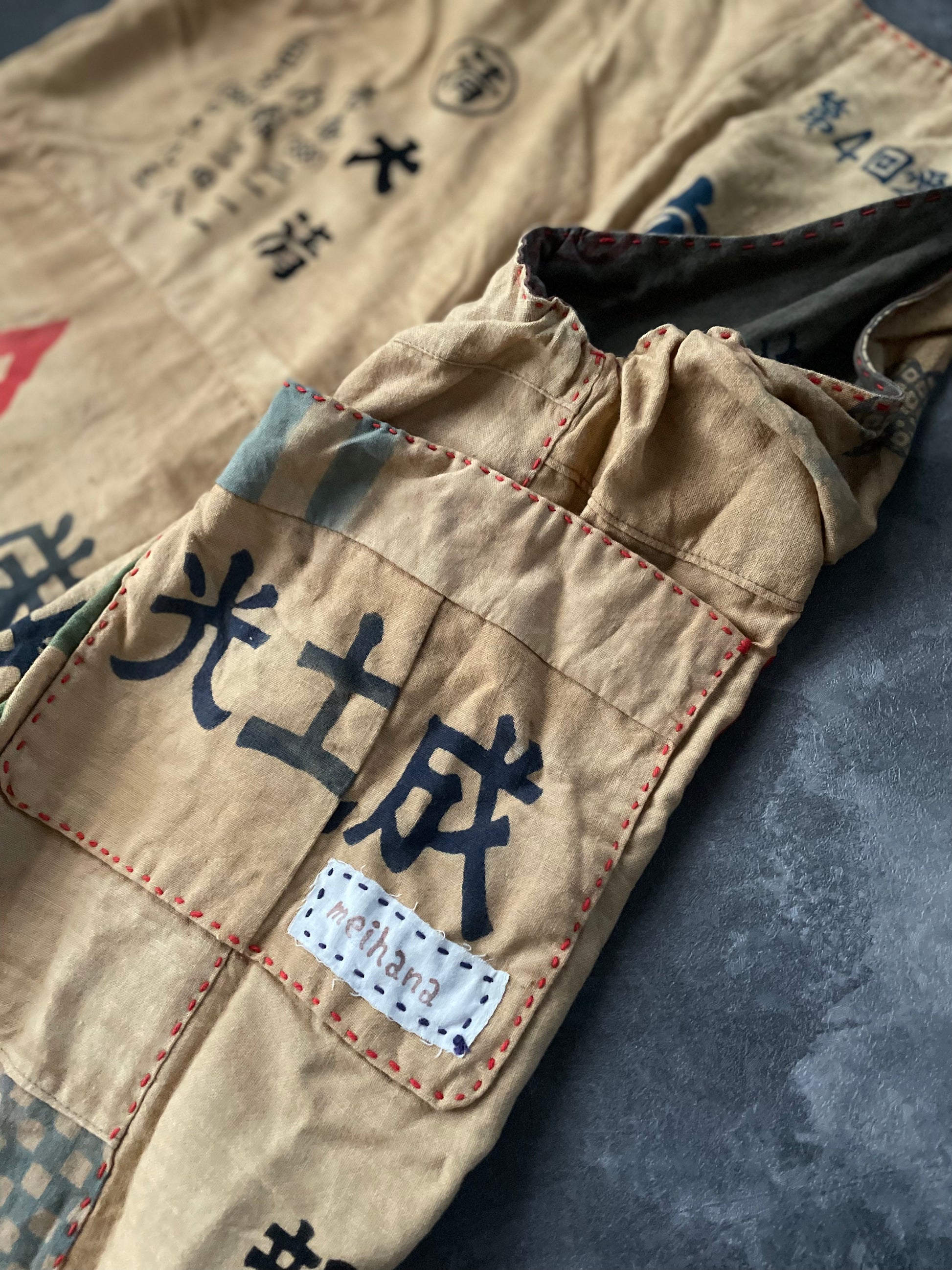 柿渋染めと、柿渋染め鉄媒染の手ぬぐいをパッチワークしてリバーシブルのサロペットパンツを作りました。