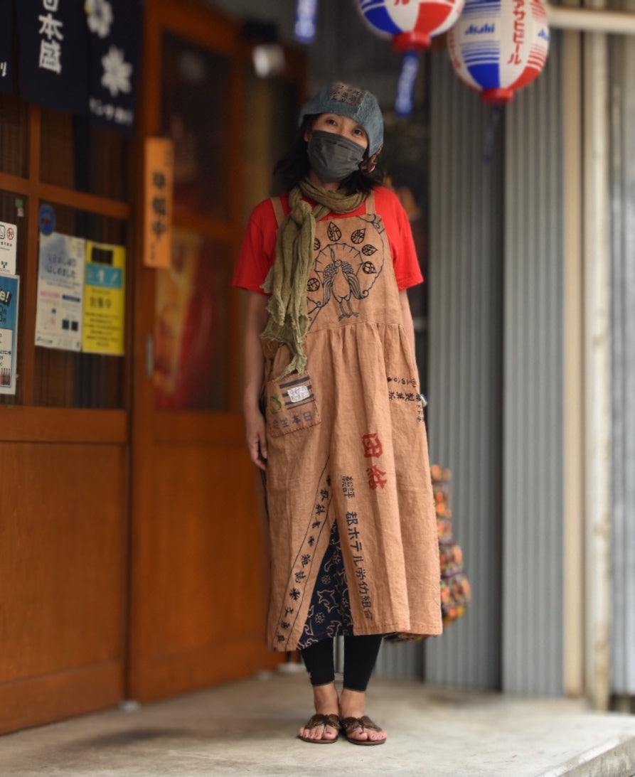 柿渋で繰り返し染めた手ぬぐいをパッチワークしたサロペットワンピースです。