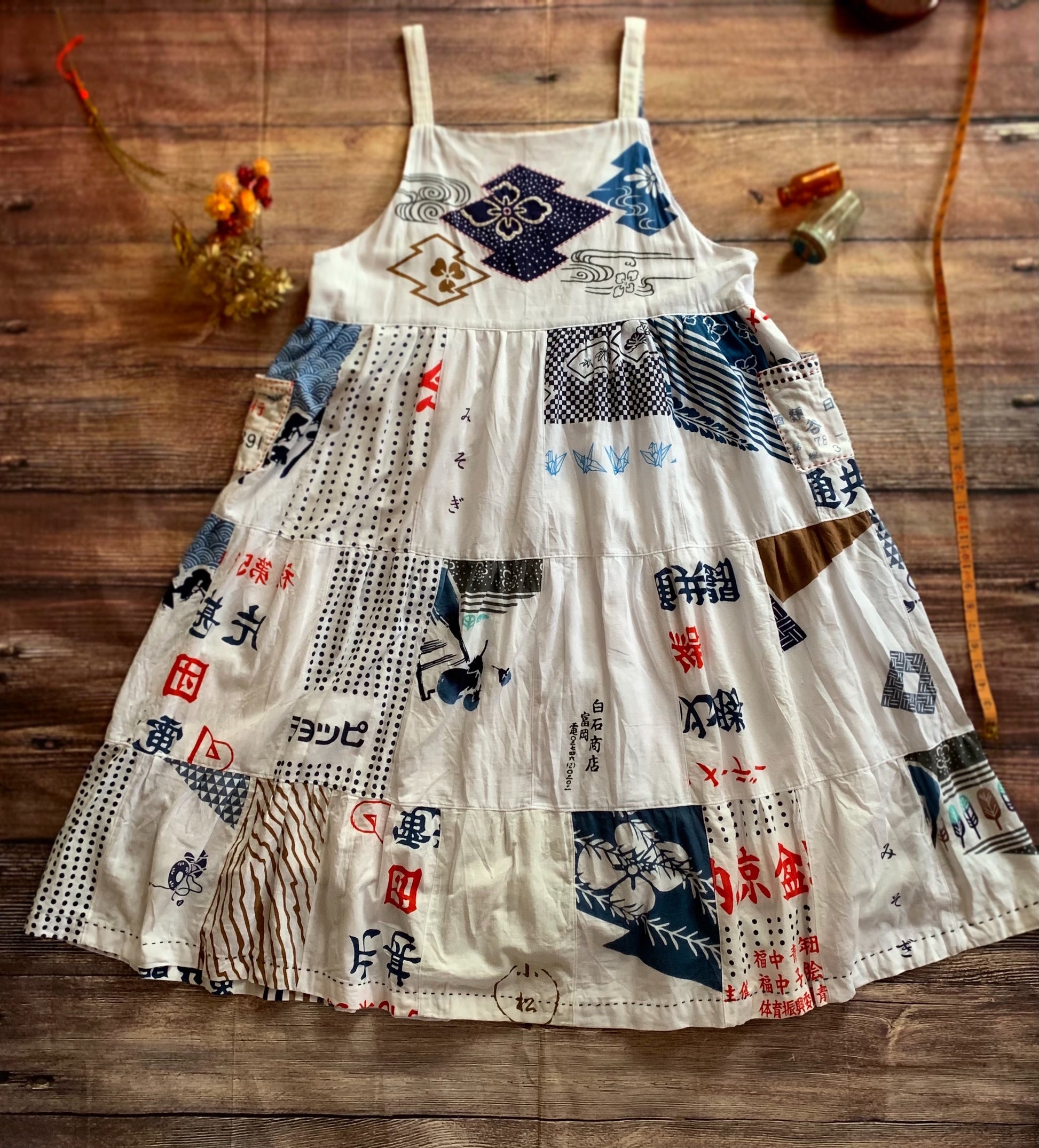 たくさんの白い手ぬぐいを小さく切って3段のティアードワンピースを作りました。
