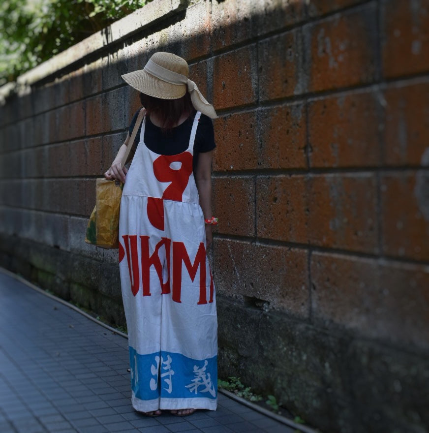 珍しいアメリカンテイストな白の大漁旗からサロペットパンツを作りました。