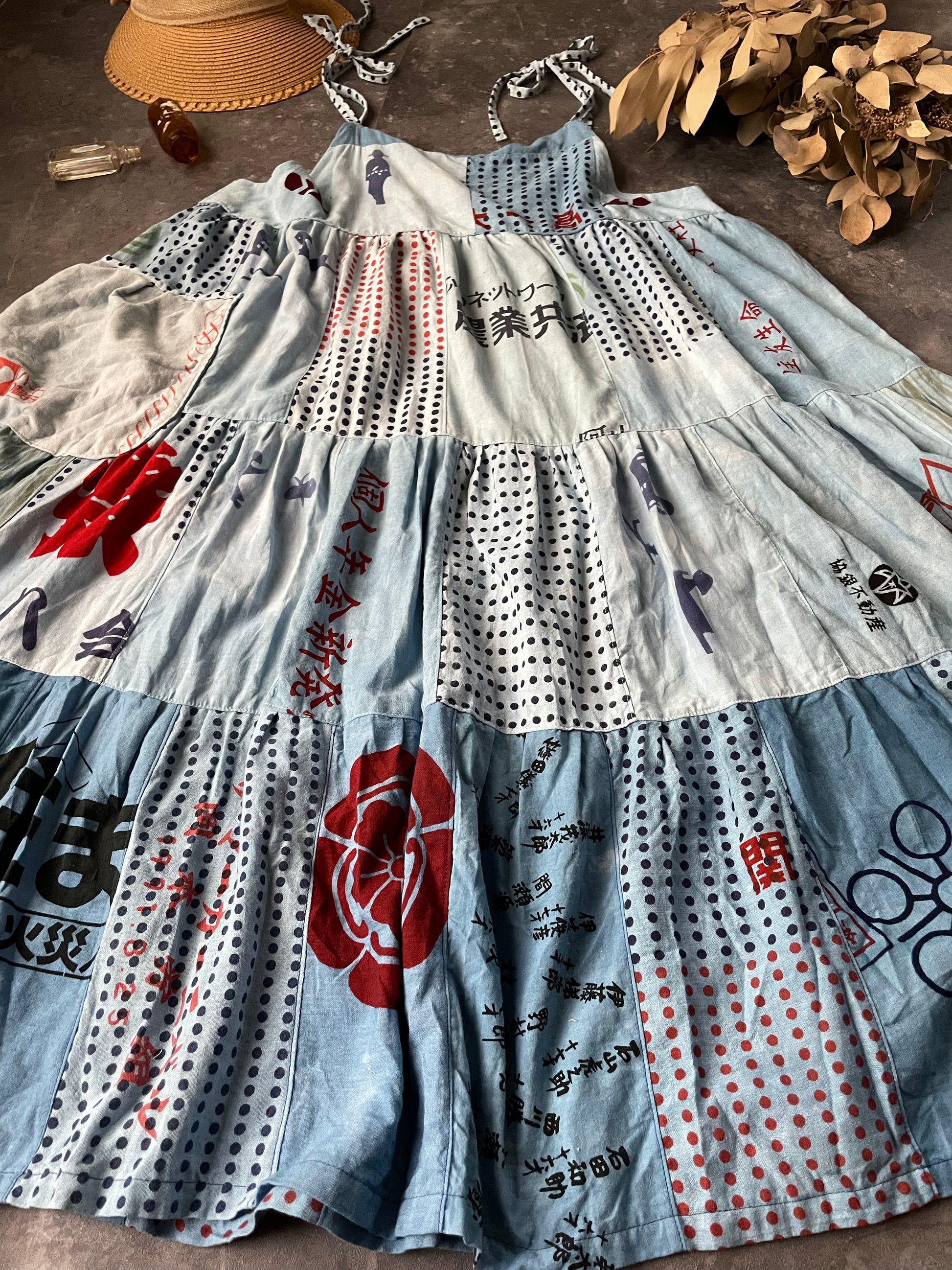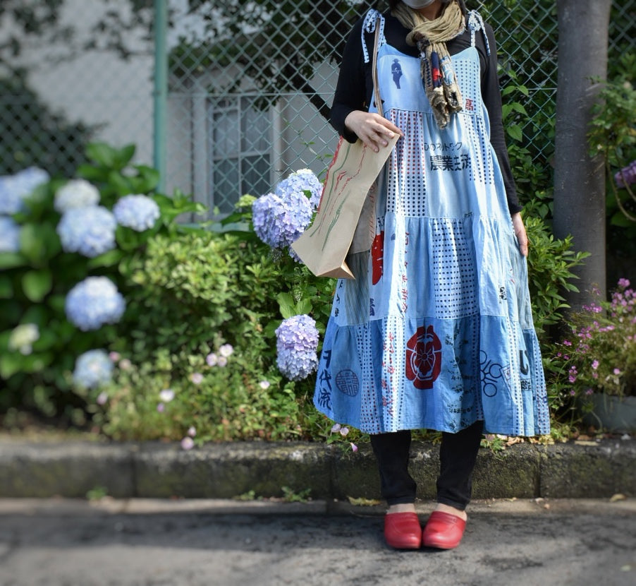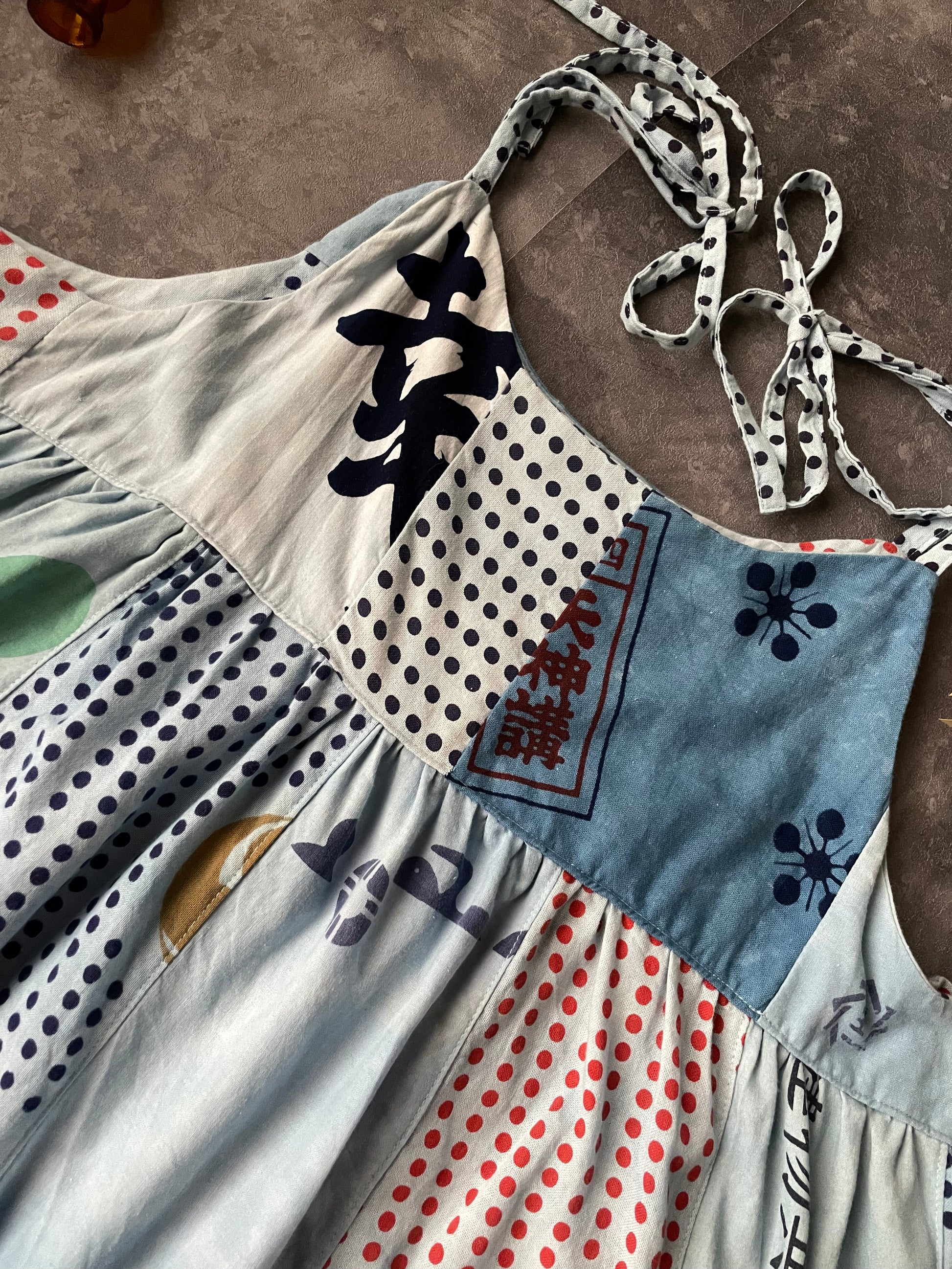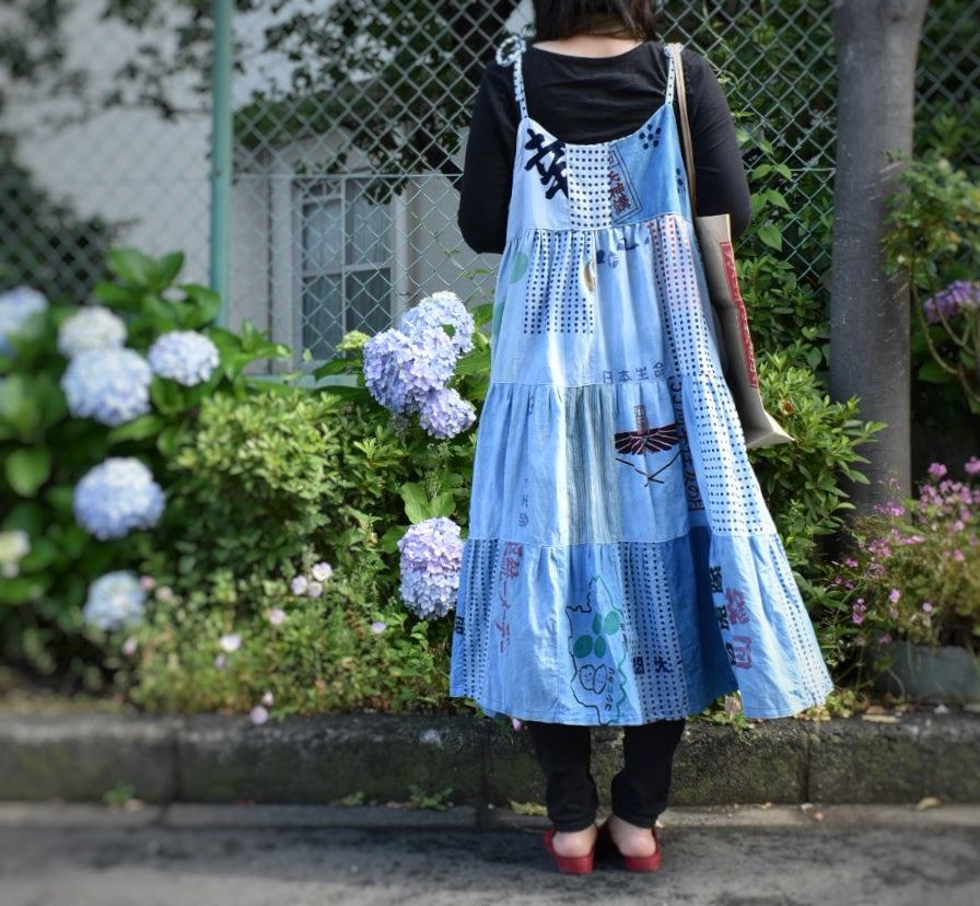 たくさんのレトロな手ぬぐいを藍染めして、小さくカットして、3段のティアードワンピースを作りました。