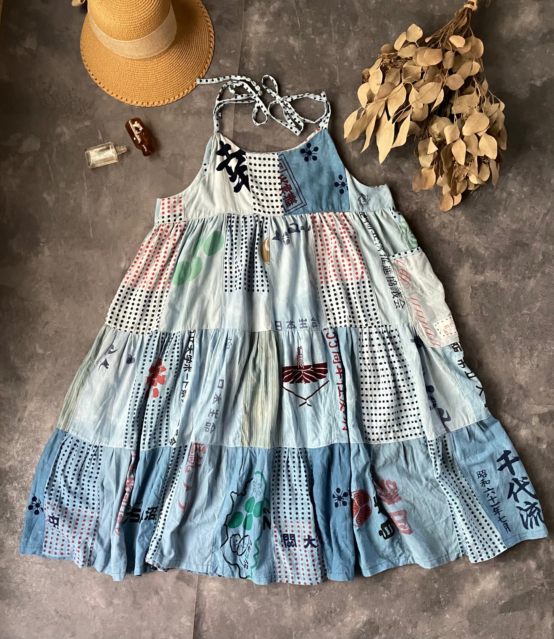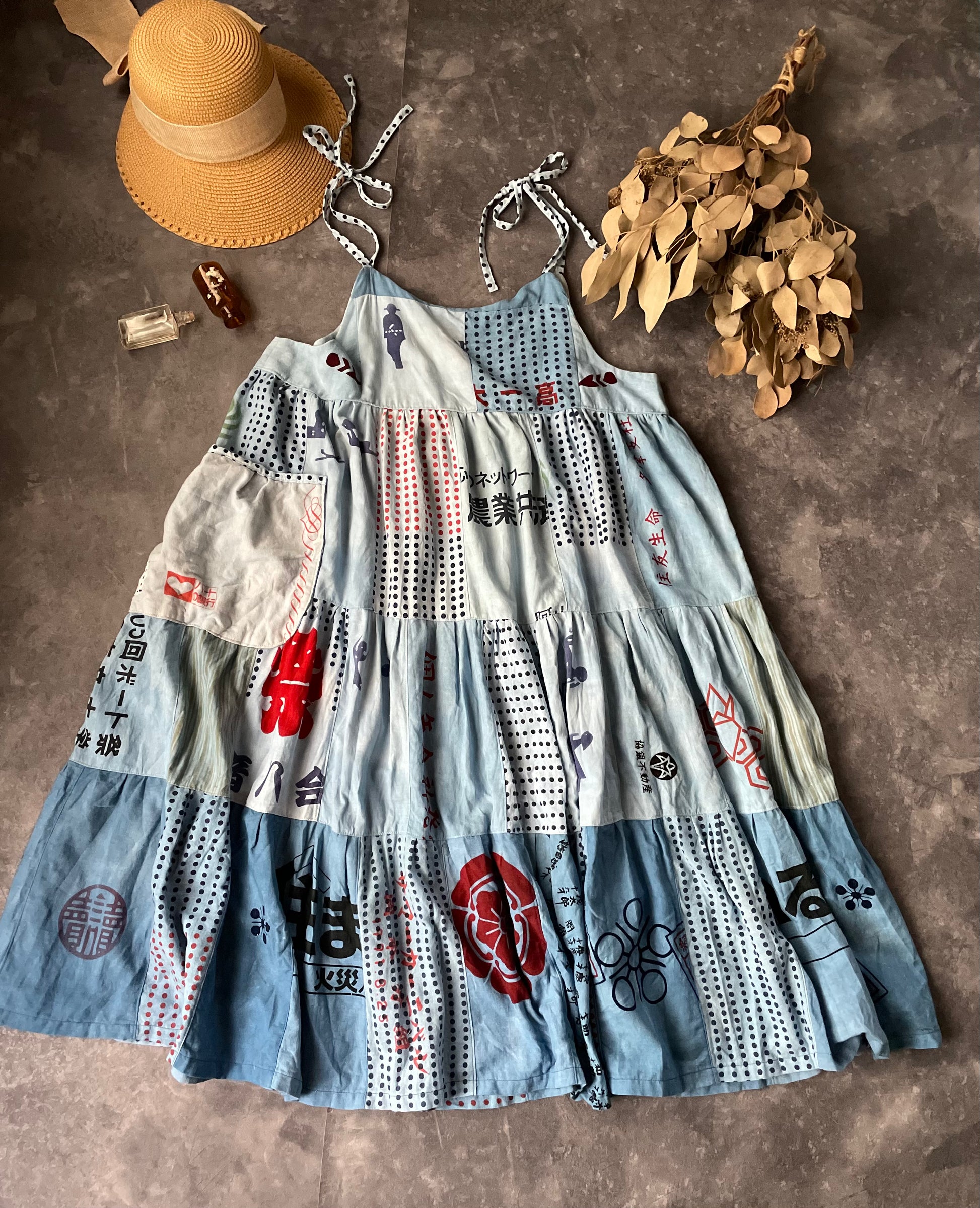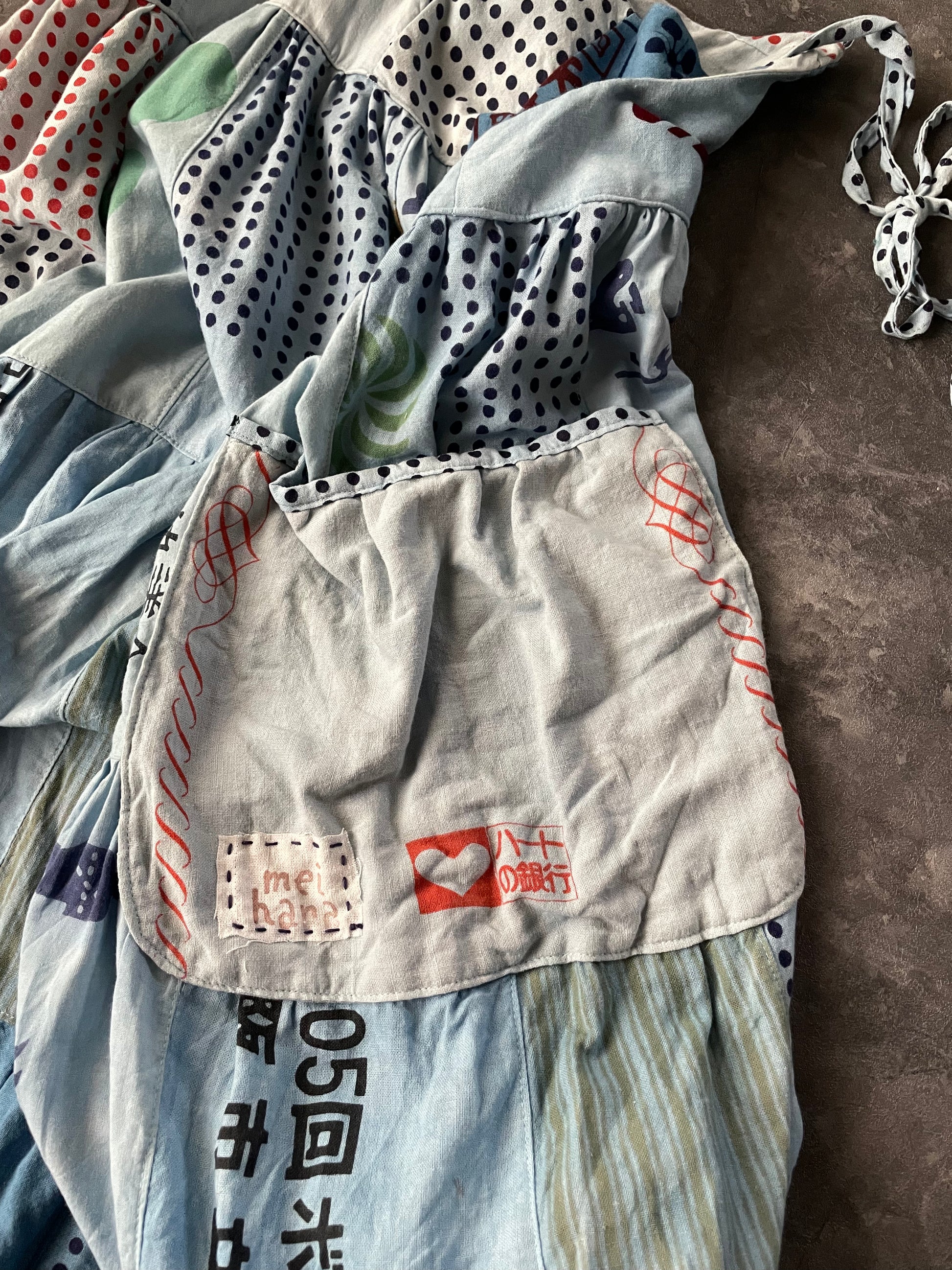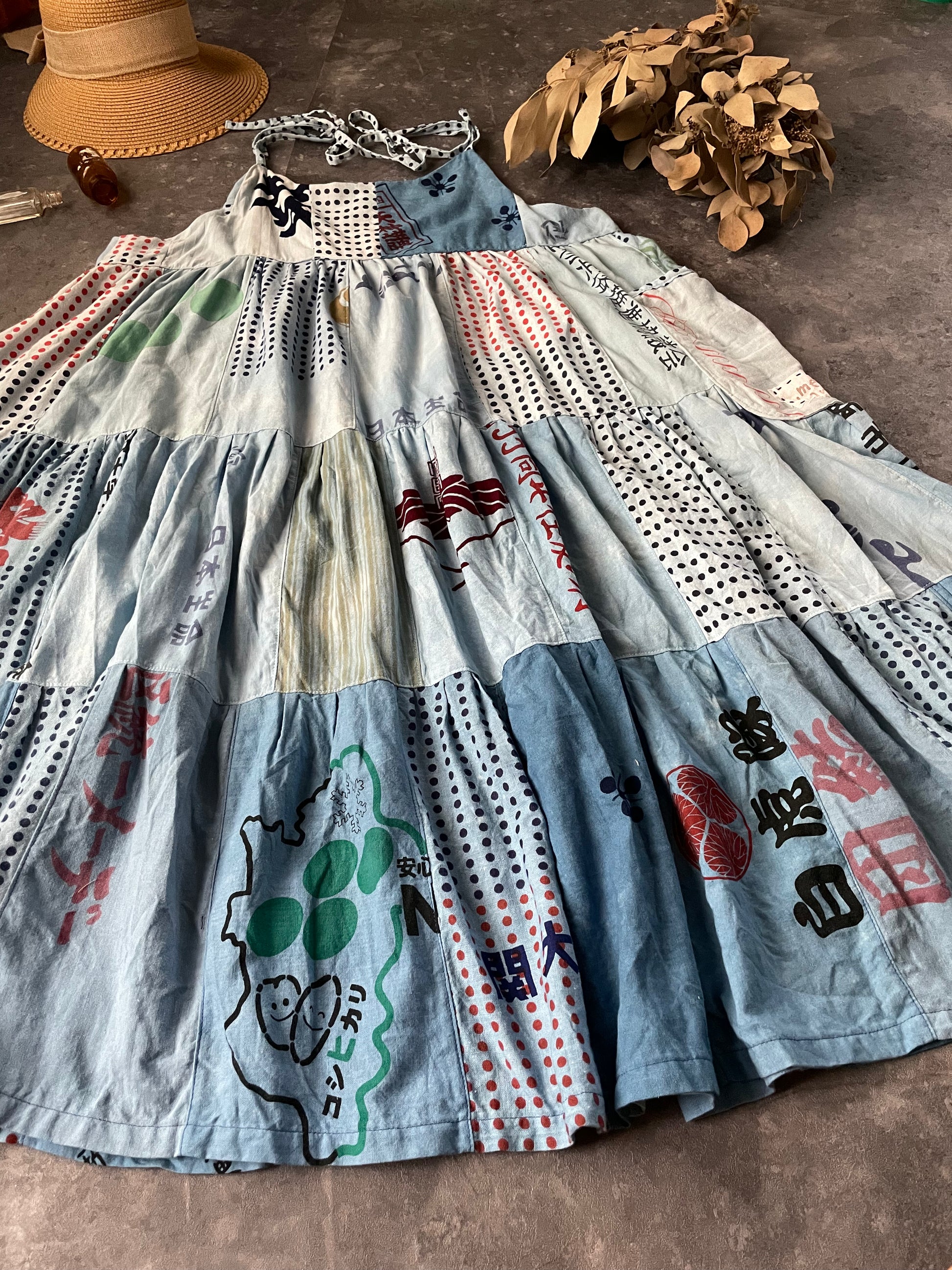 たくさんのレトロな手ぬぐいを藍染めして、小さくカットして、3段のティアードワンピースを作りました。