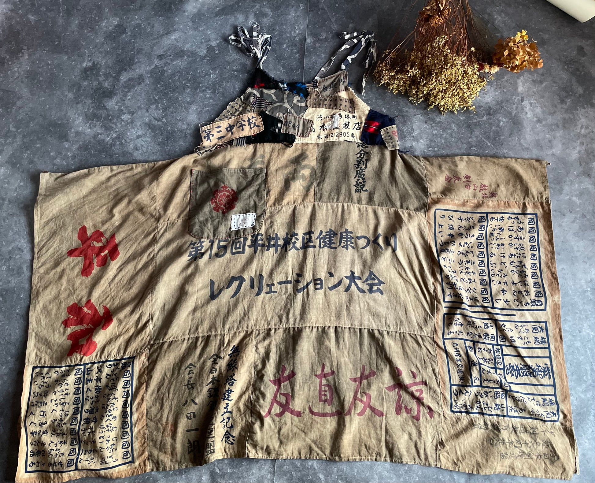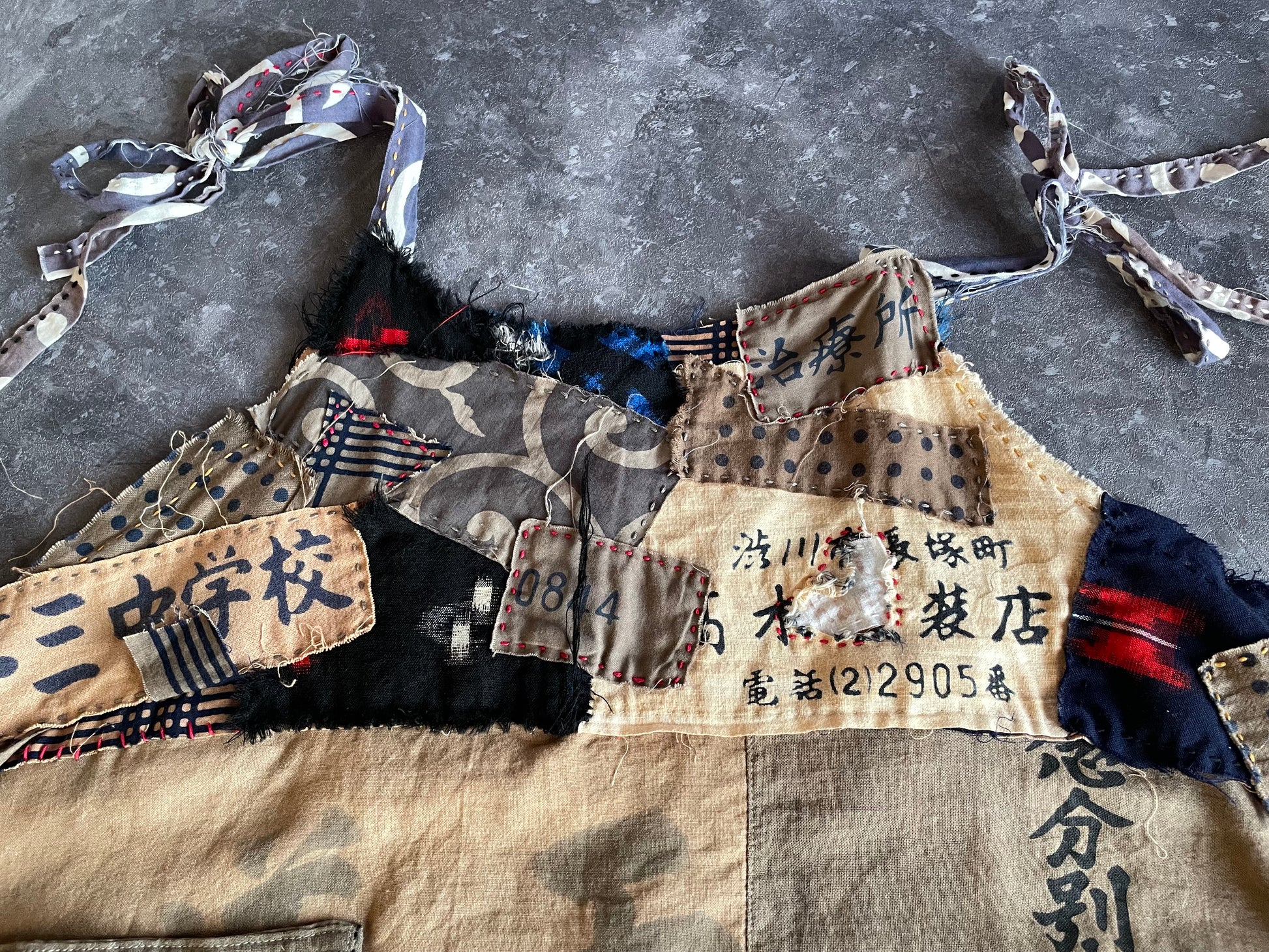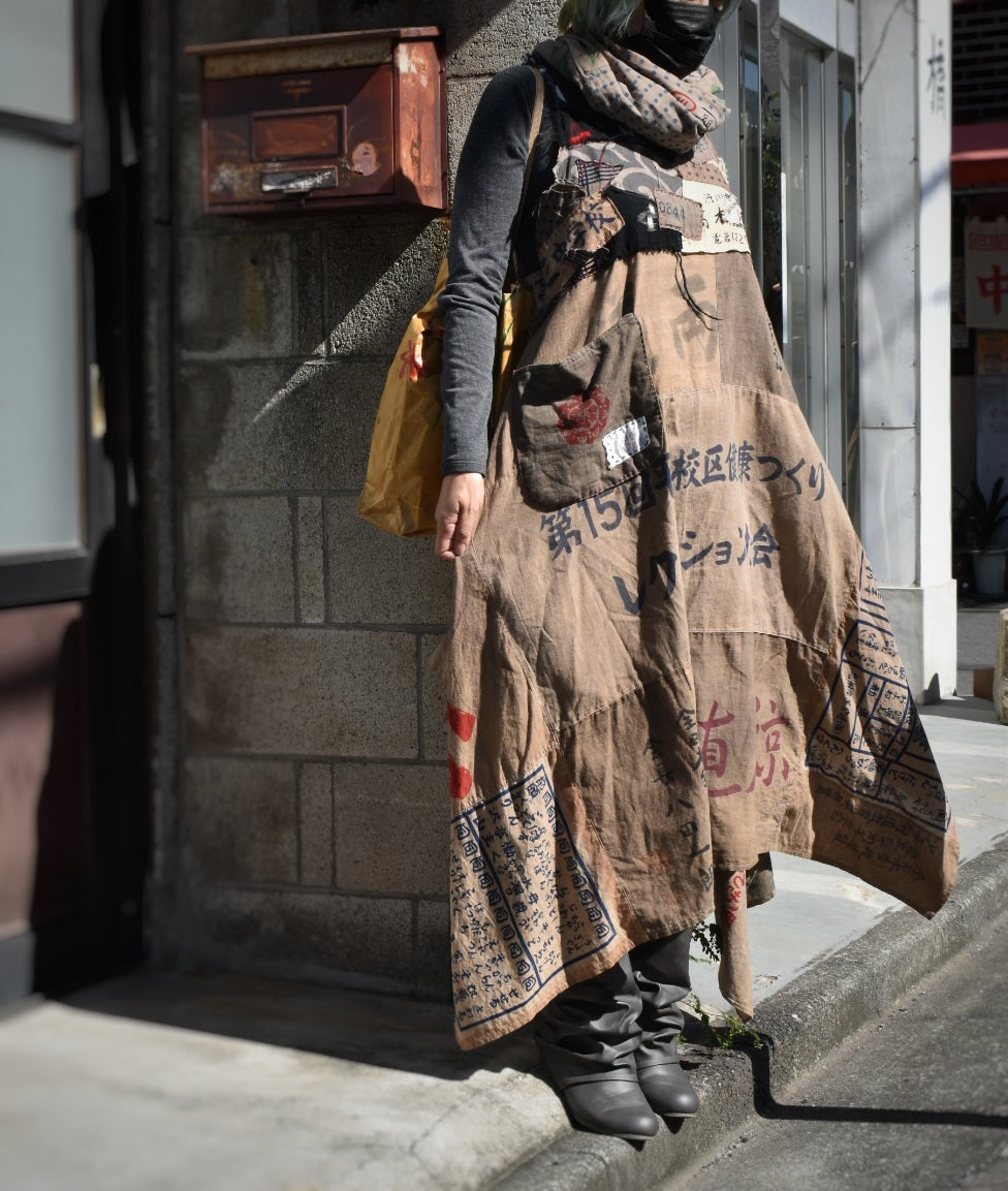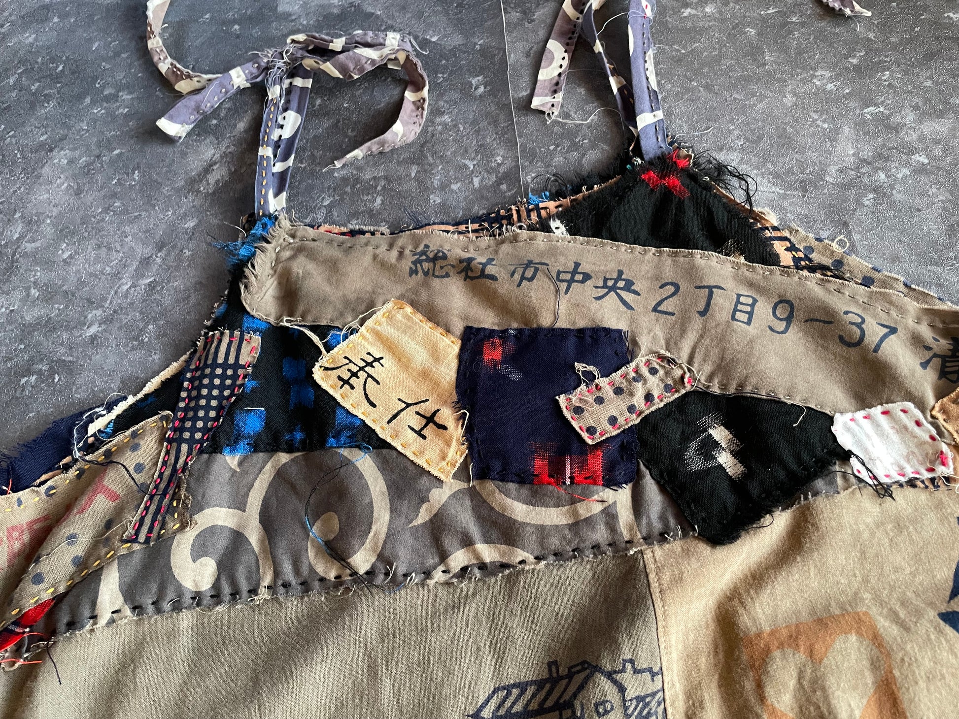 胸当部分は着物や手ぬぐい、風呂敷などのはぎれをパッチワーク、スカート部分は柿渋染め鉄媒染の手ぬぐいです。