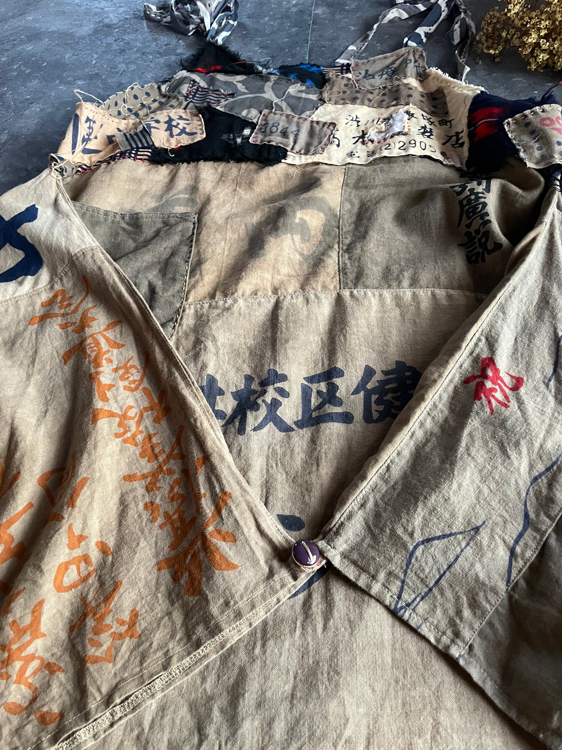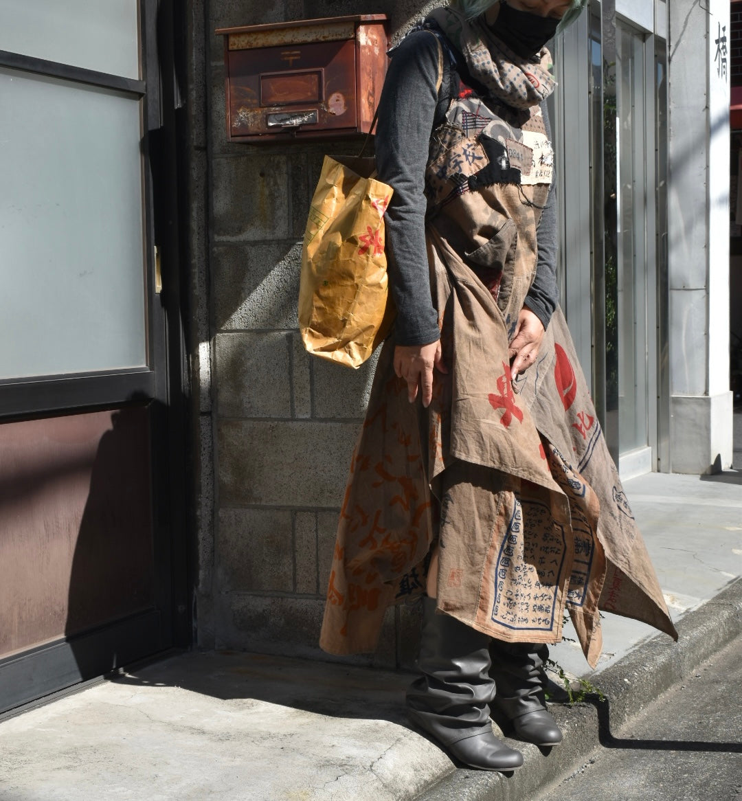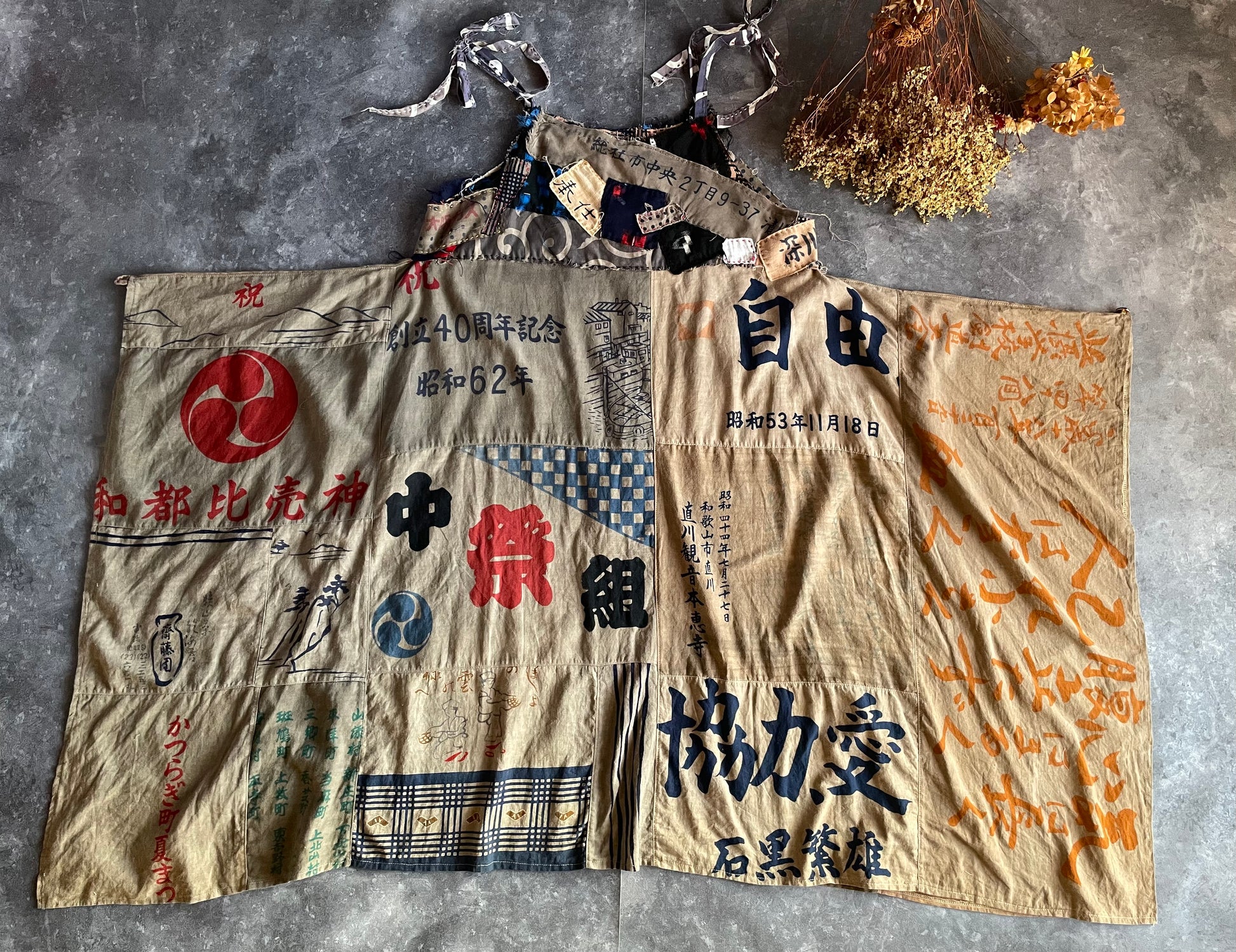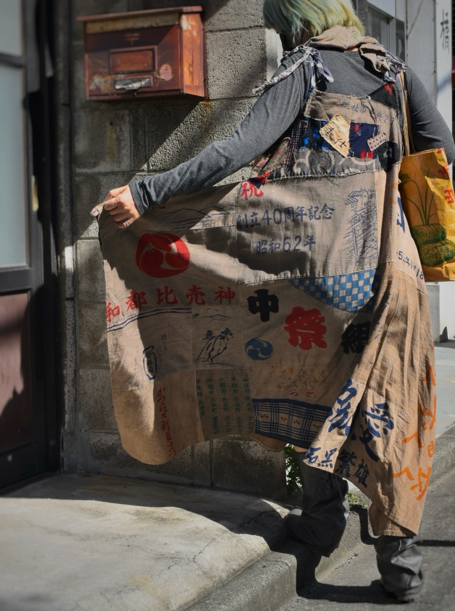 胸当部分は着物や手ぬぐい、風呂敷などのはぎれをパッチワーク、スカート部分は柿渋染め鉄媒染の手ぬぐいです。