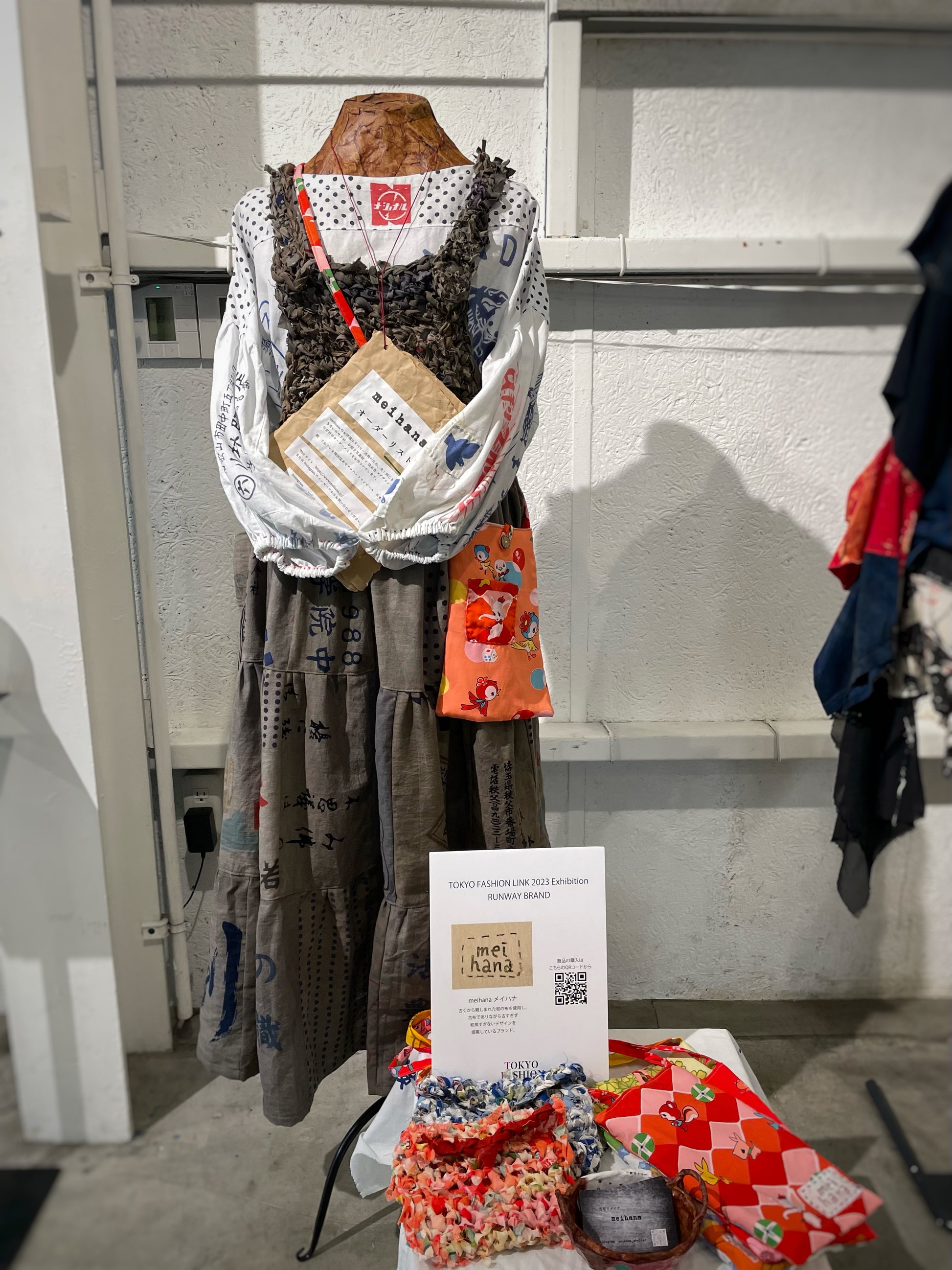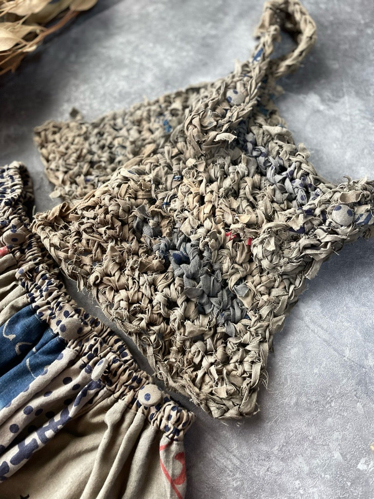 たくさんの柿渋染め、鉄媒染のてぬぐいを細くカットして3段のティアードスカートを作り、ひも状に切った生地を編んだ裂き編みの胸当てを付けました。