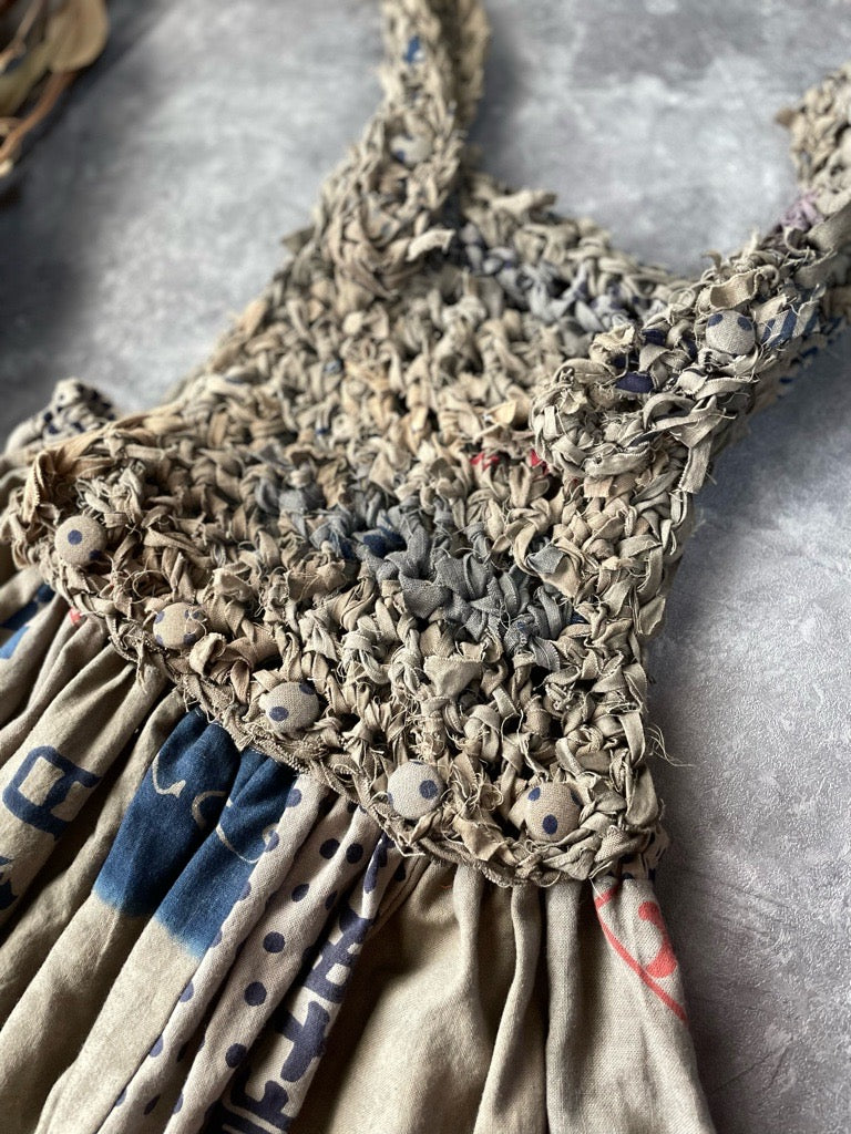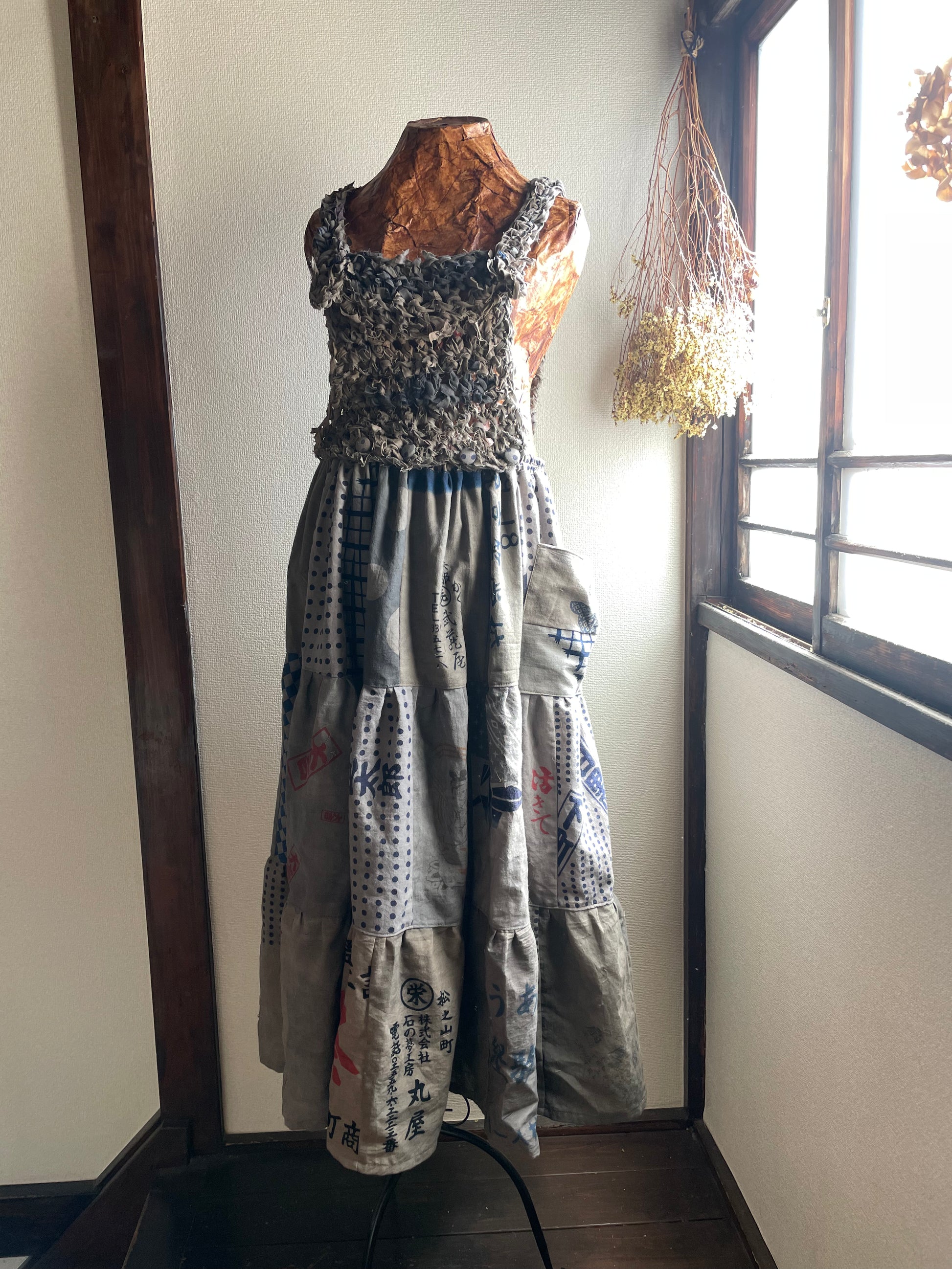 鉄媒染手ぬぐいの裂き編みティアードワンピース 2329